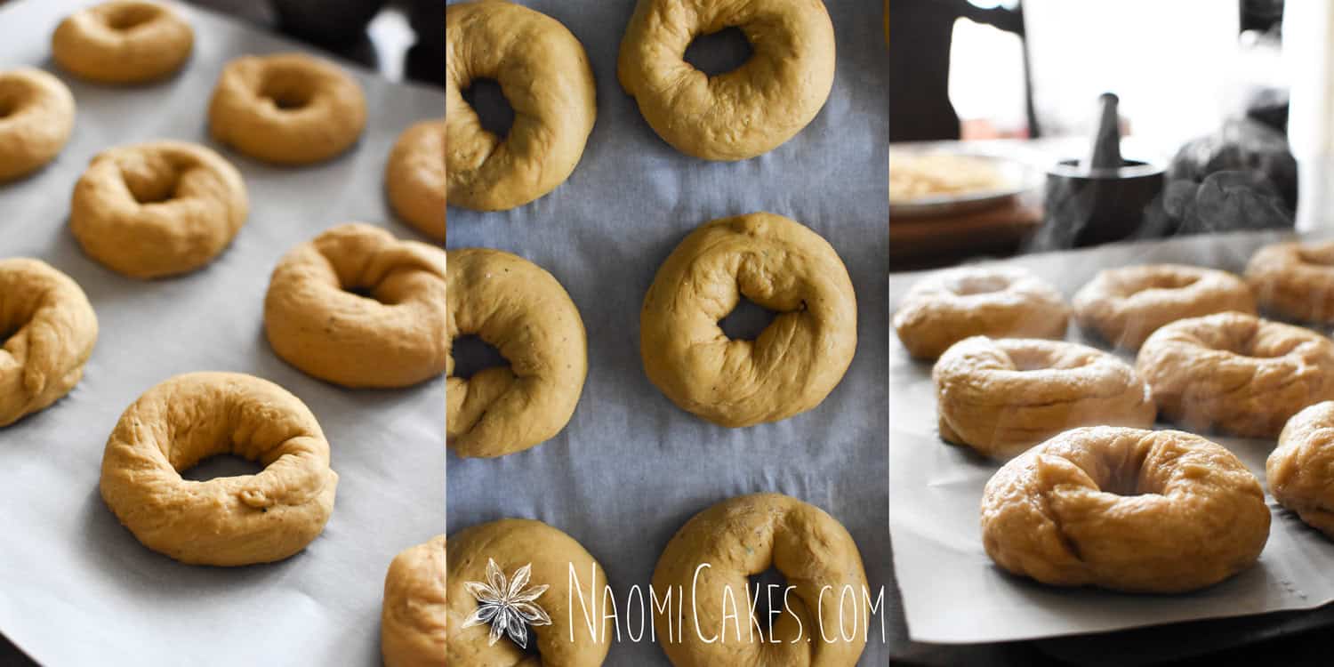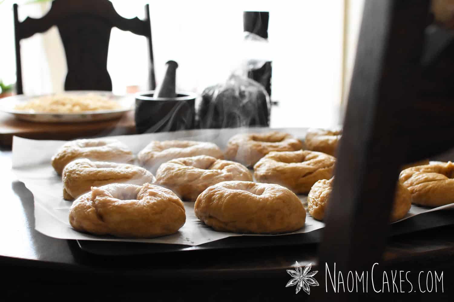 Bring the poaching syrup back to a boil, preheat the oven to 425 degrees F, and allow the bagels to rest 10-20 minutes, or until about 1-1/2 times their original size. They won’t look very much larger – just slightly more puffy.