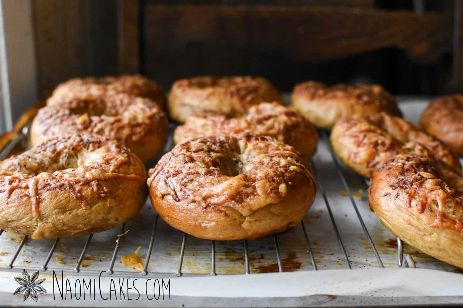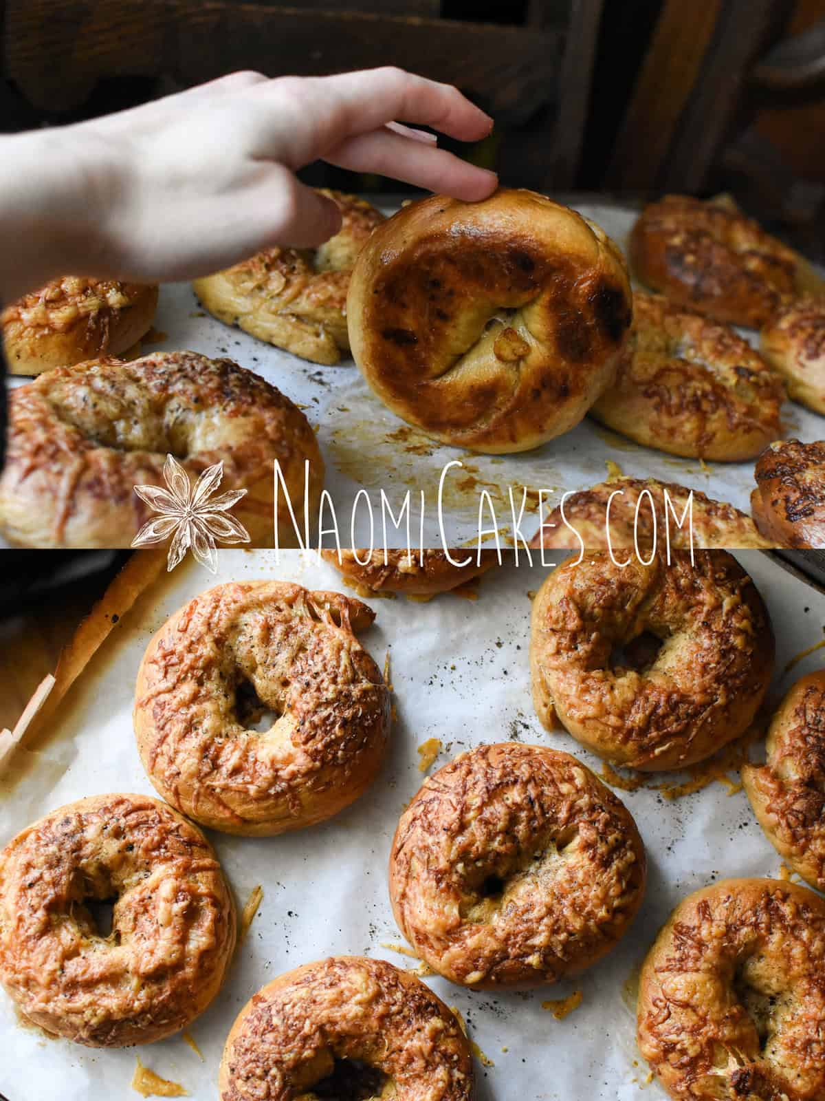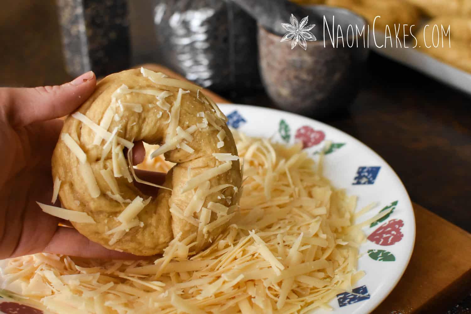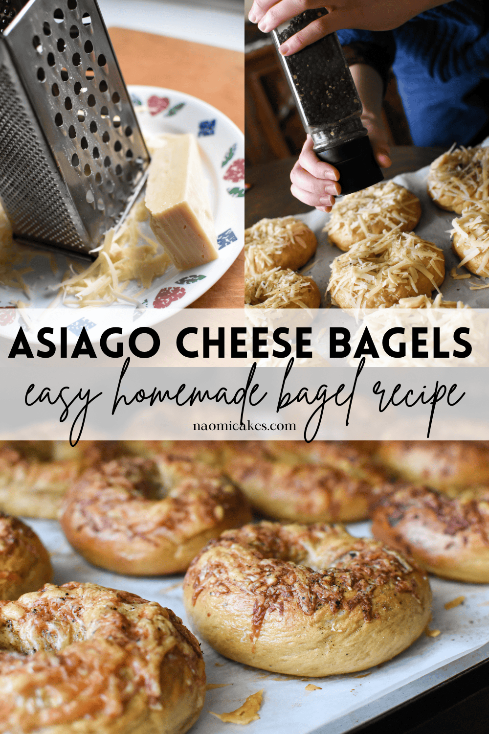 I’ve outlined the general process of making homemade bagels for you below. The main thing that makes these bagels unique, however is that the bagels are covered in freshly grated asiago cheese right before they are baked. To see this process in real time, step-by-step, scroll down past the recipe to check out my step-by-step pictures!