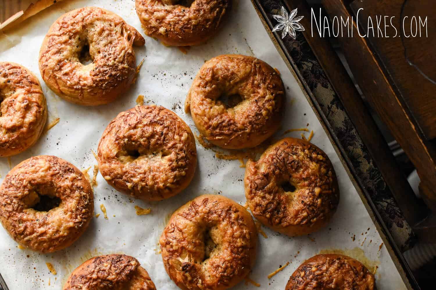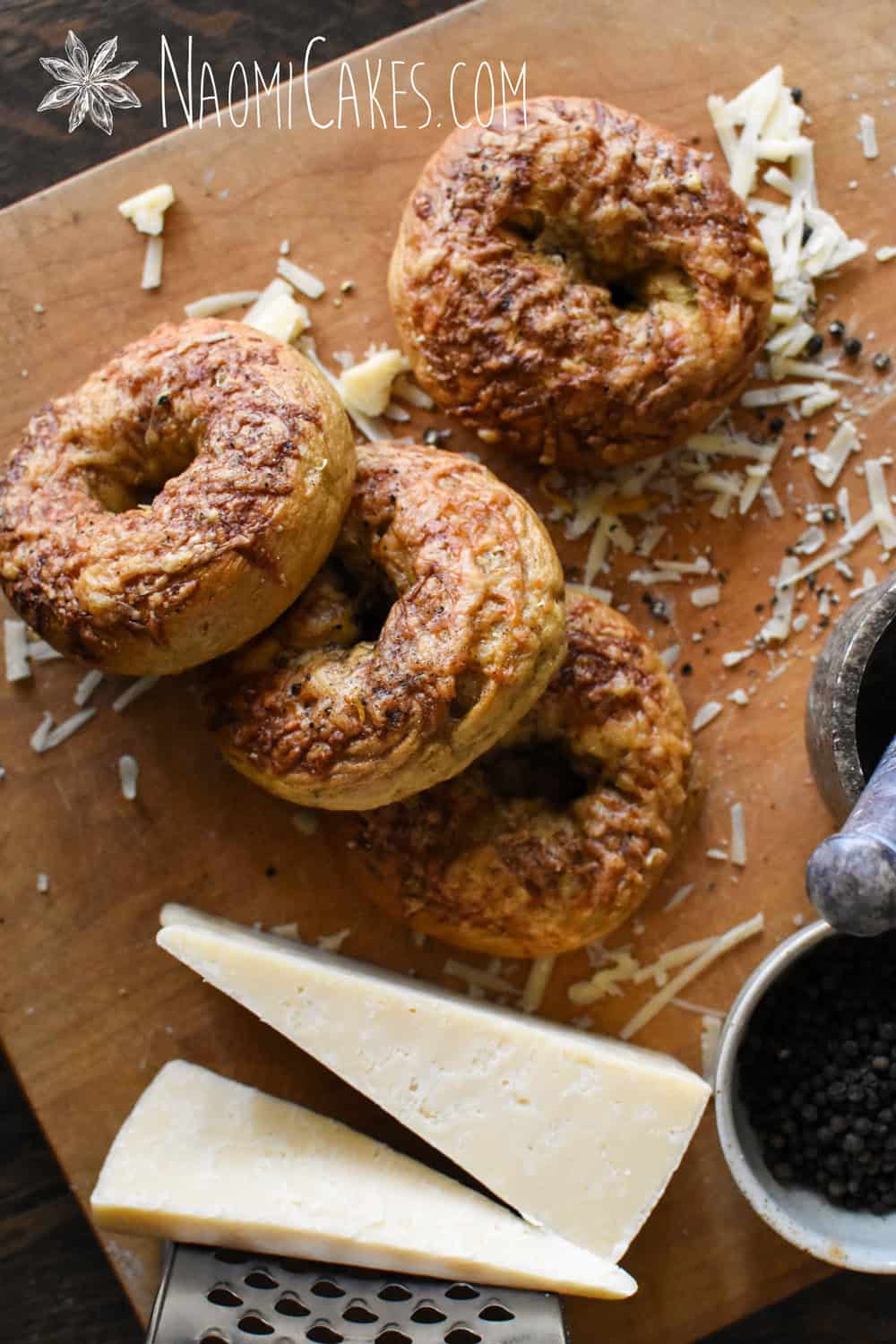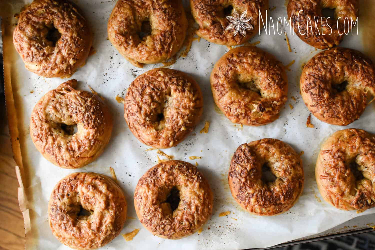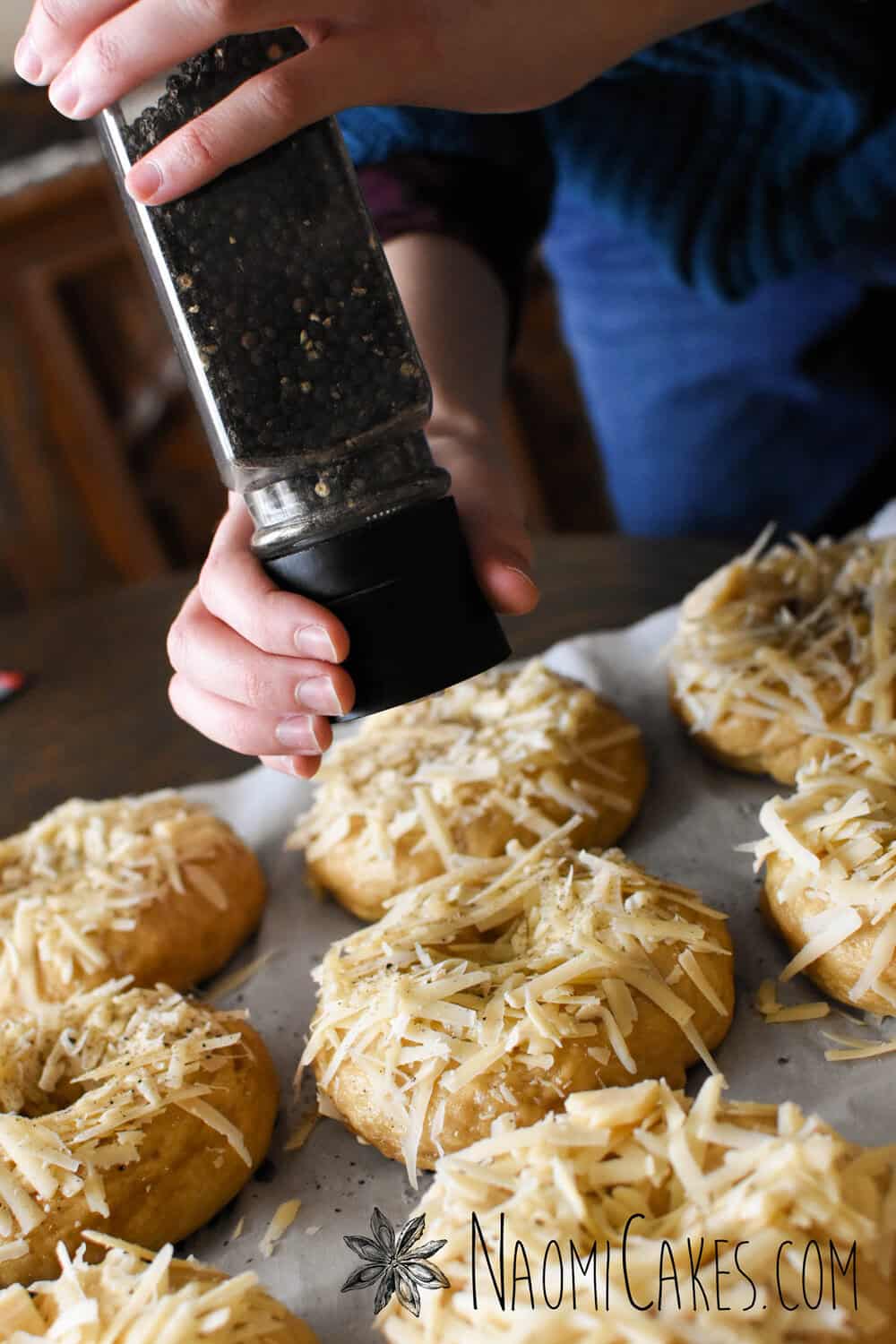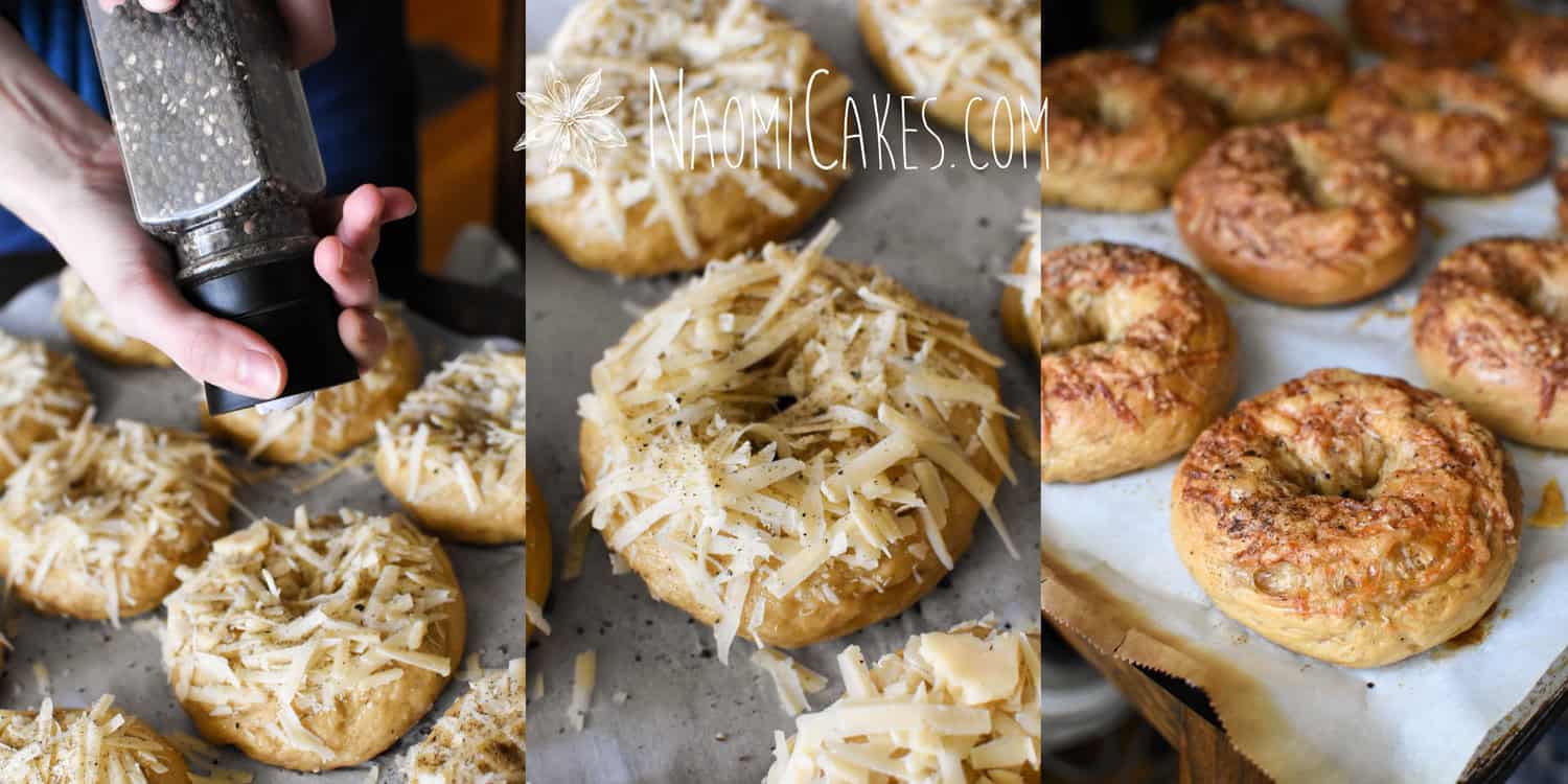 Right before they go into the oven, I sprinkle the bagels generously with freshly grated chunks of asiago cheese and cracked black pepper. Be generous with the cheese to get the ultimate cheesy bagels!