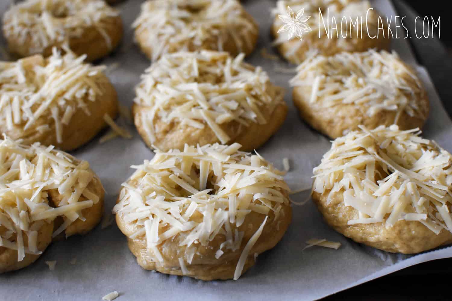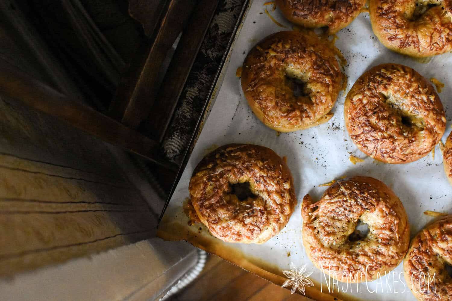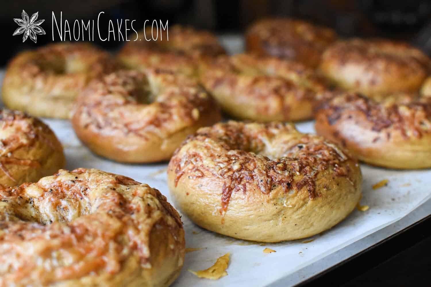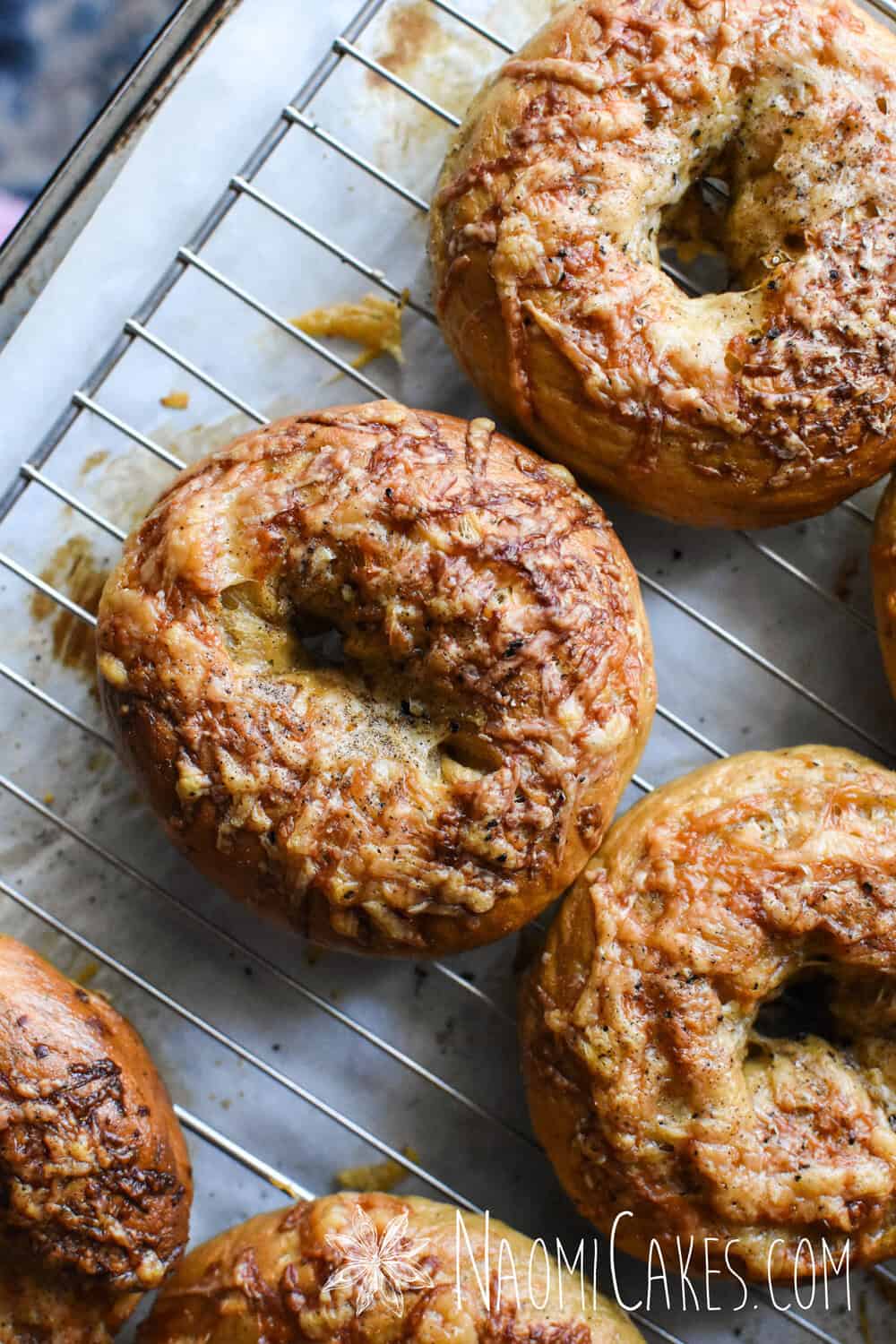 Right before they go into the oven, I sprinkle the bagels generously with freshly grated chunks of asiago cheese and cracked black pepper. Be generous with the cheese to get the ultimate cheesy bagels!