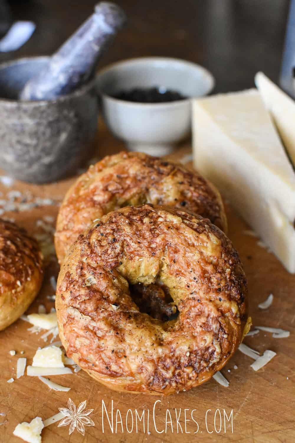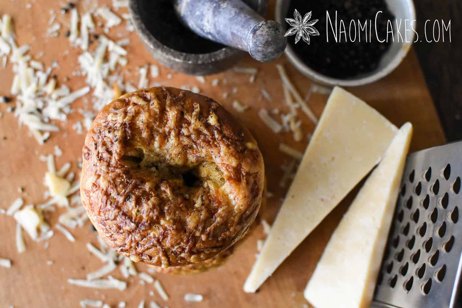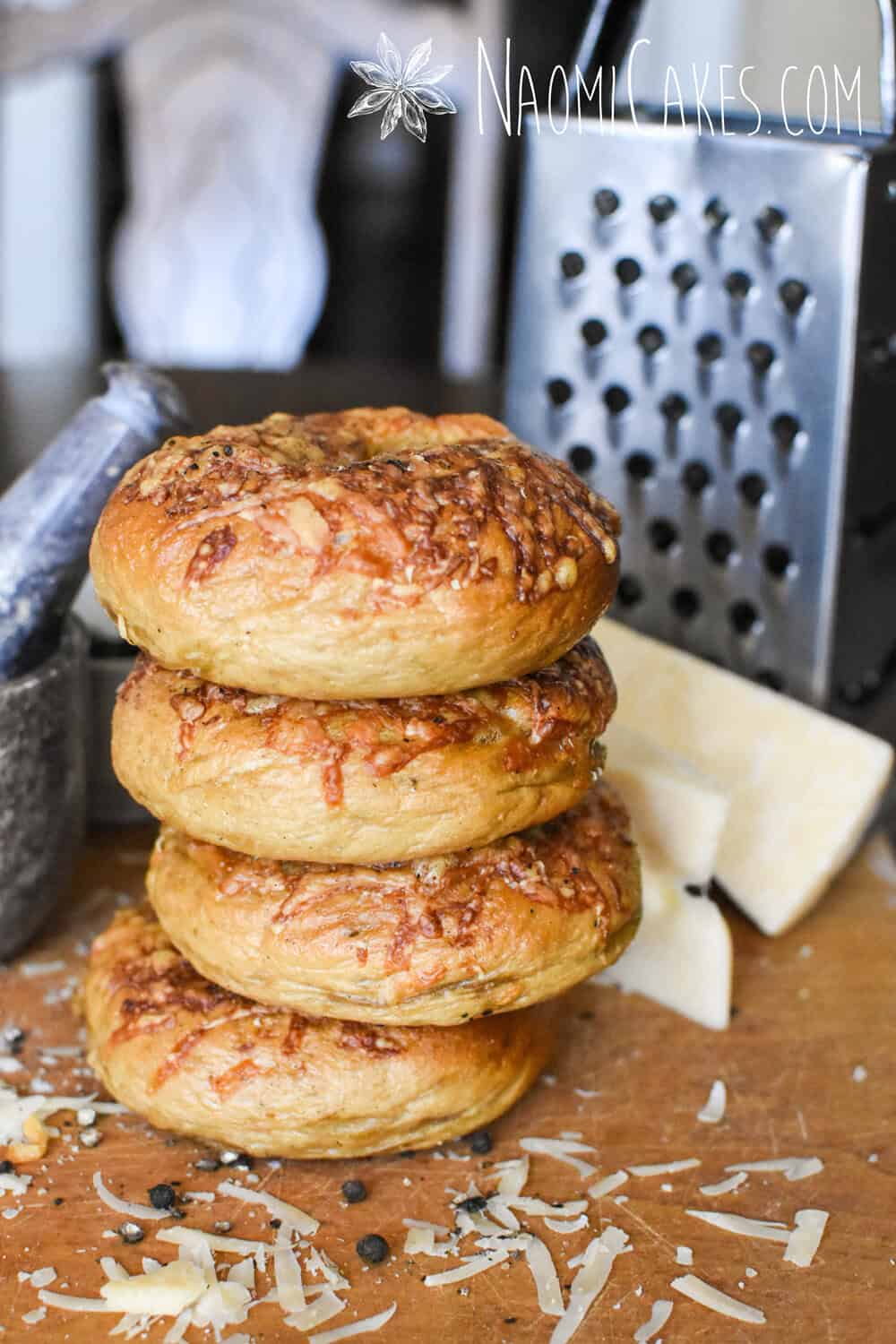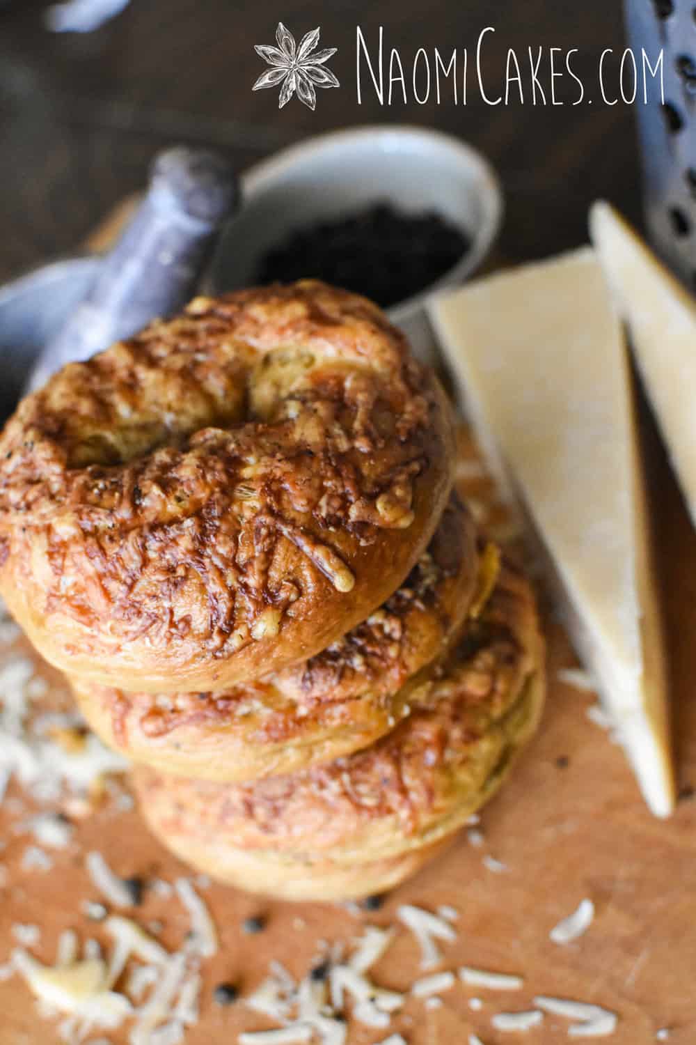 In recent weeks, I’ve shared my recipes for Montreal Style Bagels and then Everything Bagels with you- both simple, easy-to-make-at-home, delicious bagel recipes. This variation is essentially the same base as those two (so again, very simple and quick to make), only… These are topped with a generous portion of asiago cheese and sprinkled with black pepper. Sounds delicious, right? It does – because it is!