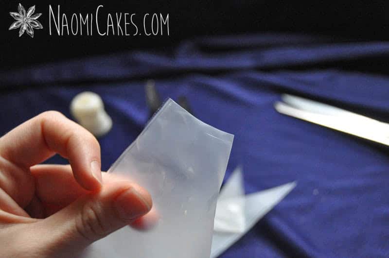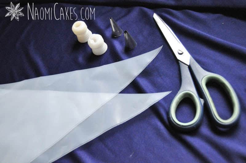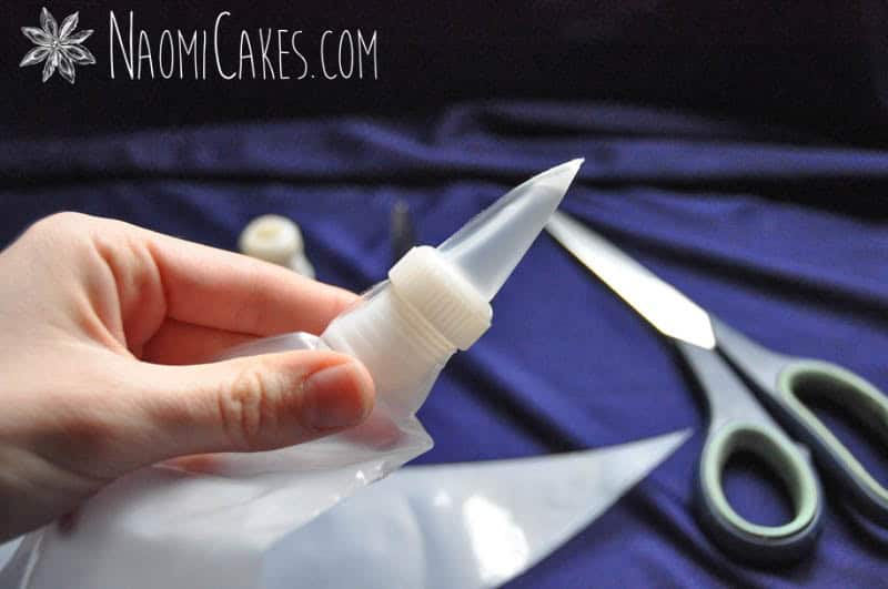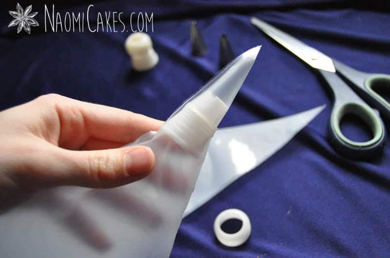 If you want to make your own with what you have on hand, you can cut out a large triangle of parchment or wax paper and then fold it into a cone shape. Then cut off the end, slip a piping tip inside, fill it up with frosting and away you go. The only thing I don’t like about this method is that you can’t usually refill the bag, so this is best used when you have small details to pipe onto your project.
