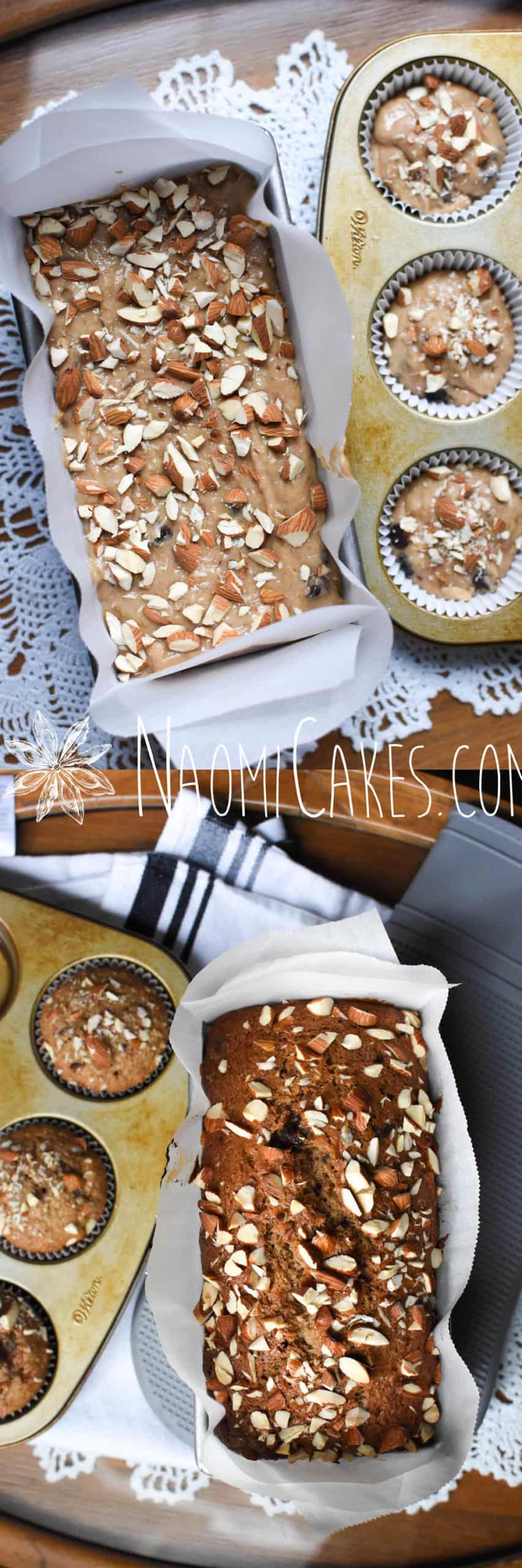 Note: For these pictures, I used a 1-lb loaf pan (a little smaller than a typical loaf pan) and a muffin tin (to make muffins with the extra batter).