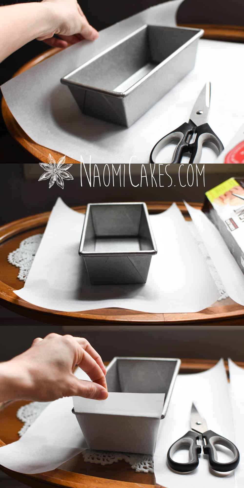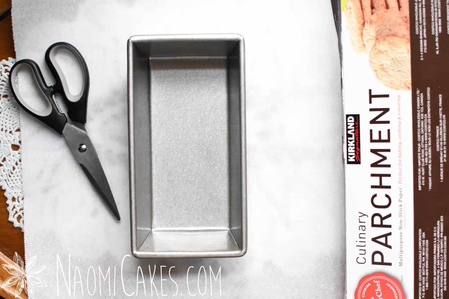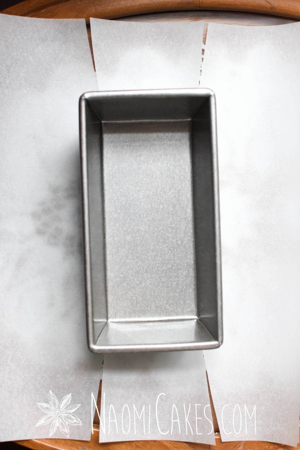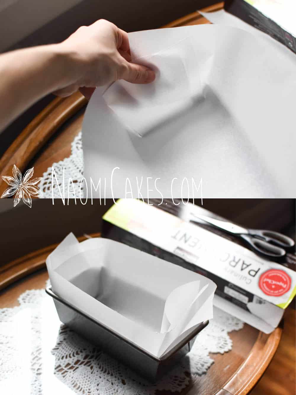 - Now set your cut sheet of parchment into the baking pan, with the long ends folded behind the little flaps of paper that match the ends of your loaf pan.