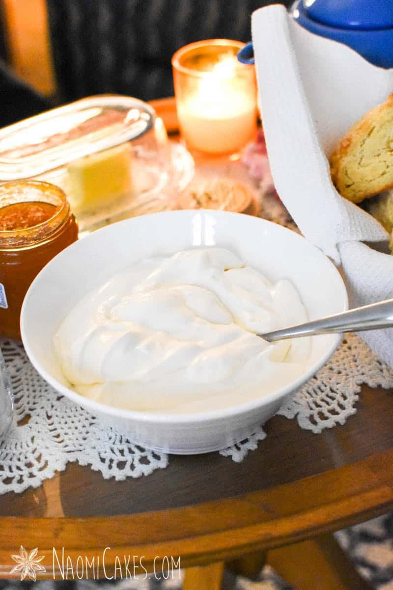 As I’ve already mentioned, this particular variation of clotted cream is much lighter. I’ve tried several different recipe variations for Devonshire cream over the years, and somehow this one remains my favourite. It is just barely sweet, soft as a cloud, and slightly tangy from the small addition of sour cream folded into it.