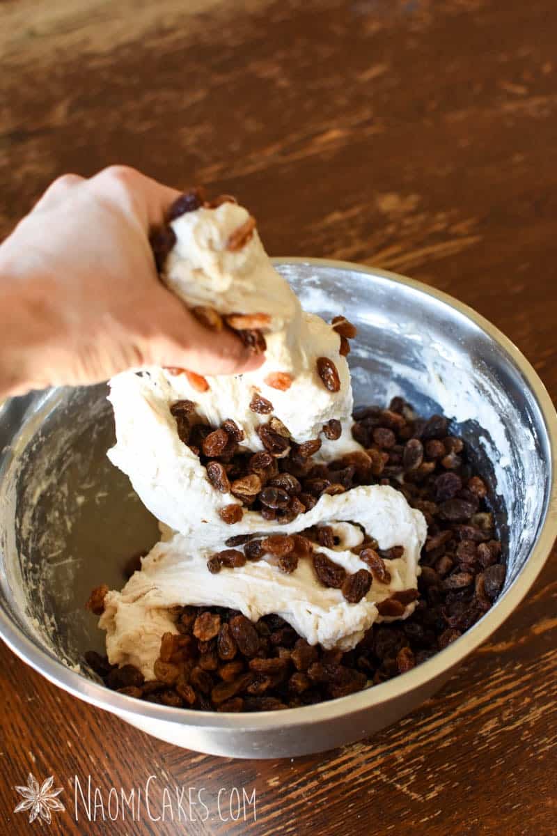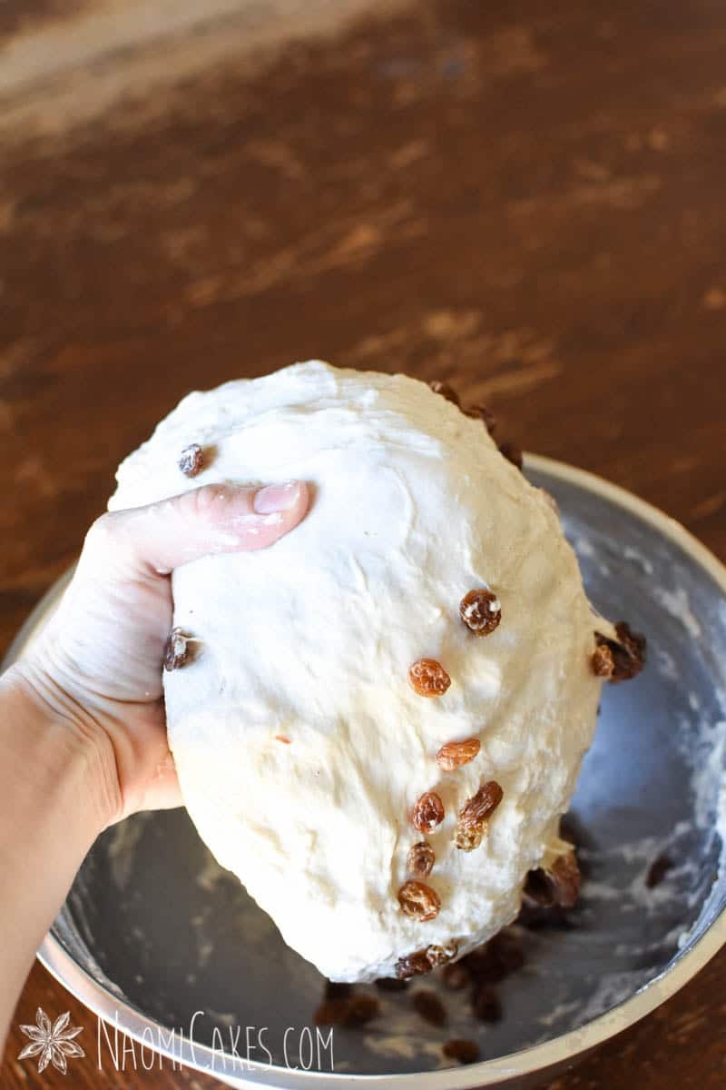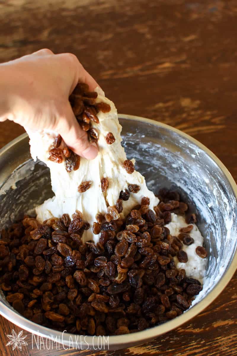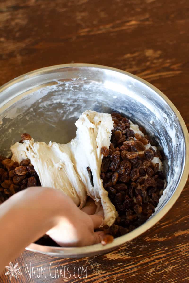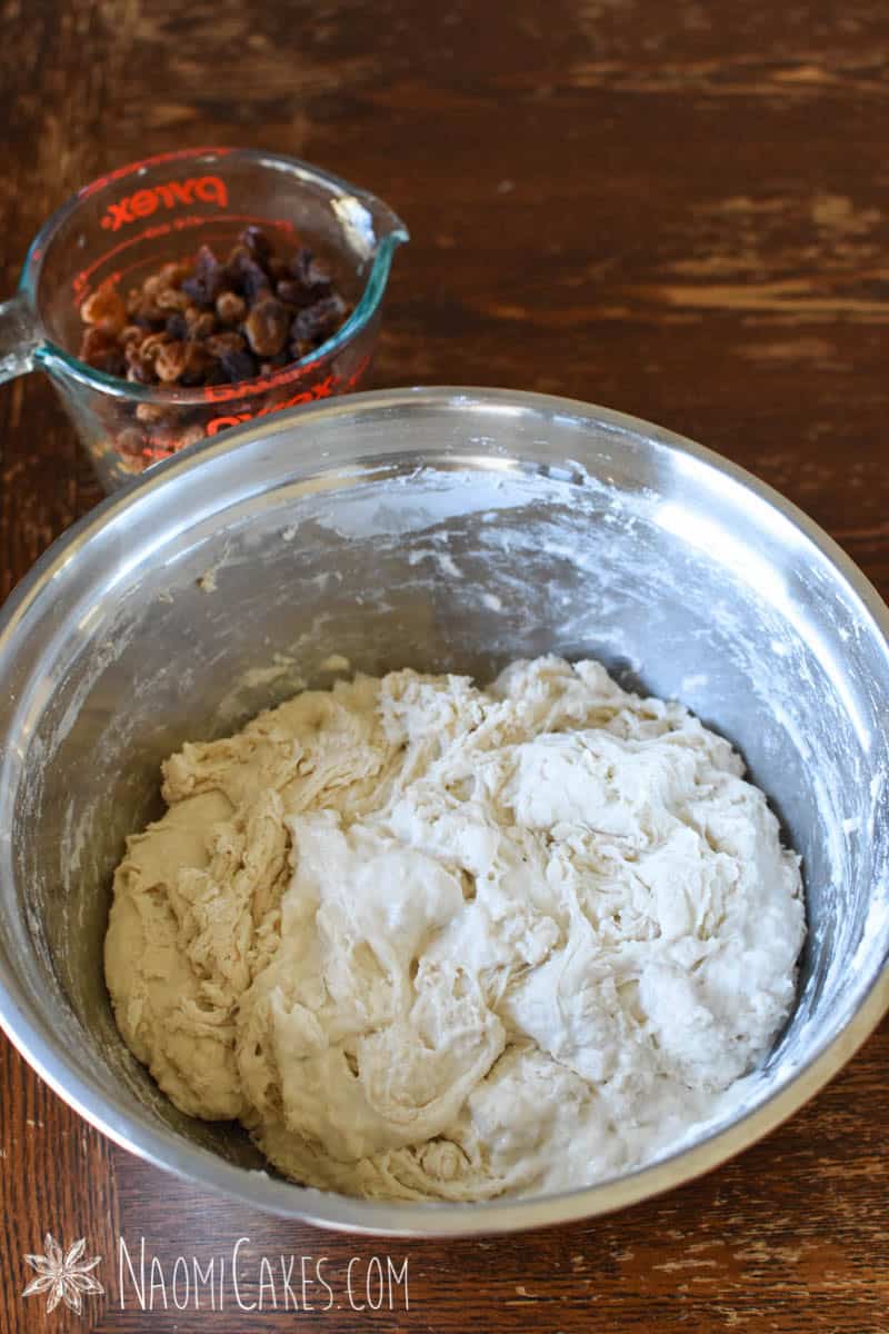 3. Once the dough has rested for 30 minutes, add the soaked raisins. Stick your hand under the dough, grab a handful, and pull it up as high as you can without breaking it. Fold the stretched dough down over the top of the whole amount. Repeat this process from different sides of the dough 4-5 times, or until the dough isn’t “loose” anymore and it begins to feel stronger, or “taut”. Cover, and allow this to rest 30 minutes.