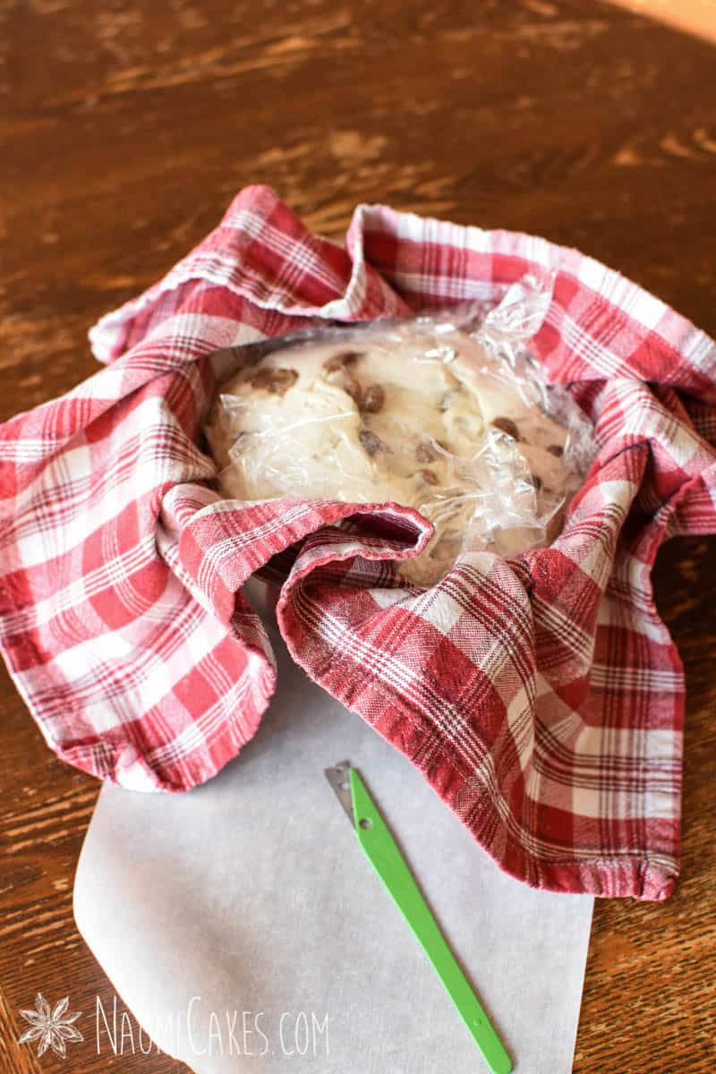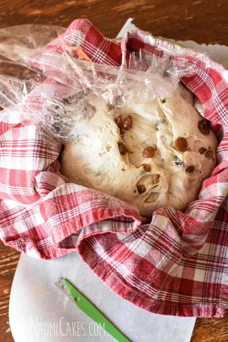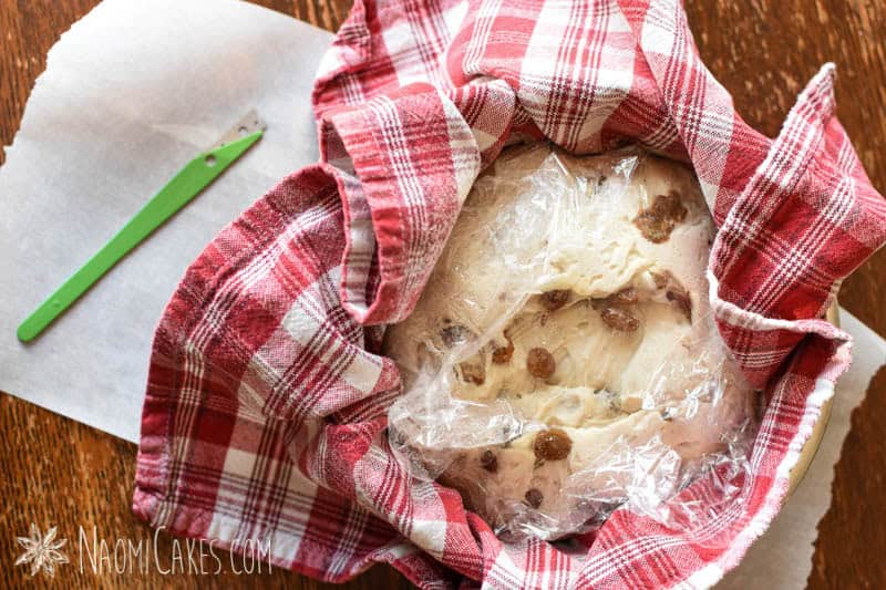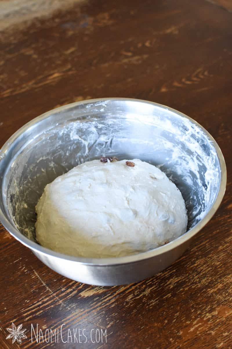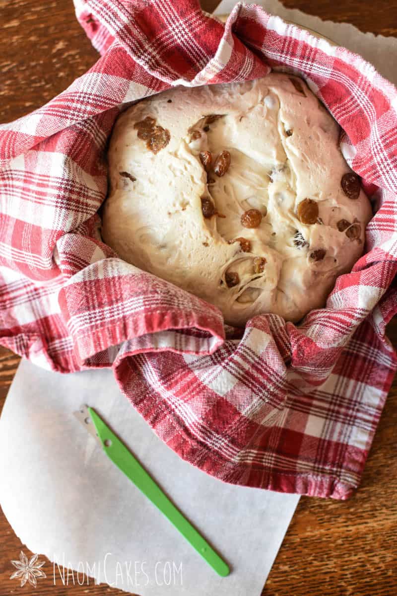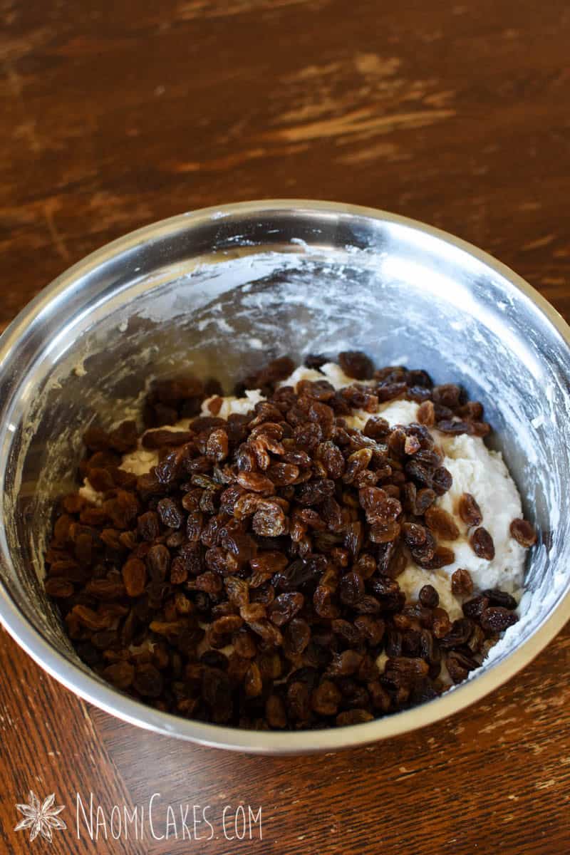 3. Once the dough has rested for 30 minutes, add the soaked raisins. Stick your hand under the dough, grab a handful, and pull it up as high as you can without breaking it. Fold the stretched dough down over the top of the whole amount. Repeat this process from different sides of the dough 4-5 times, or until the dough isn’t “loose” anymore and it begins to feel stronger, or “taut”. Cover, and allow this to rest 30 minutes.
