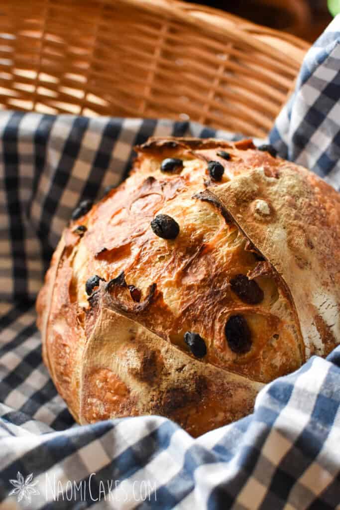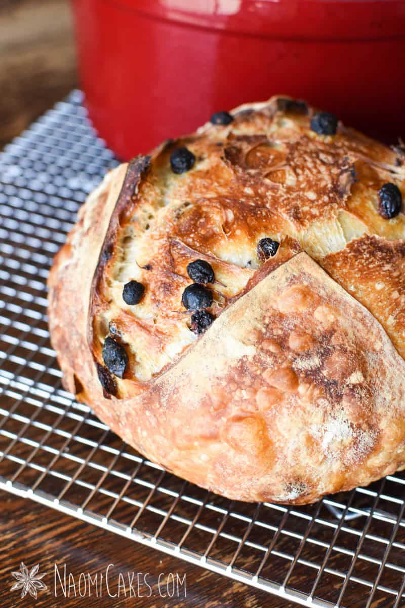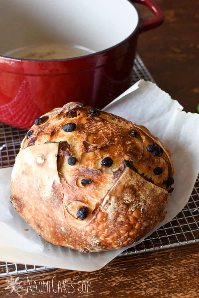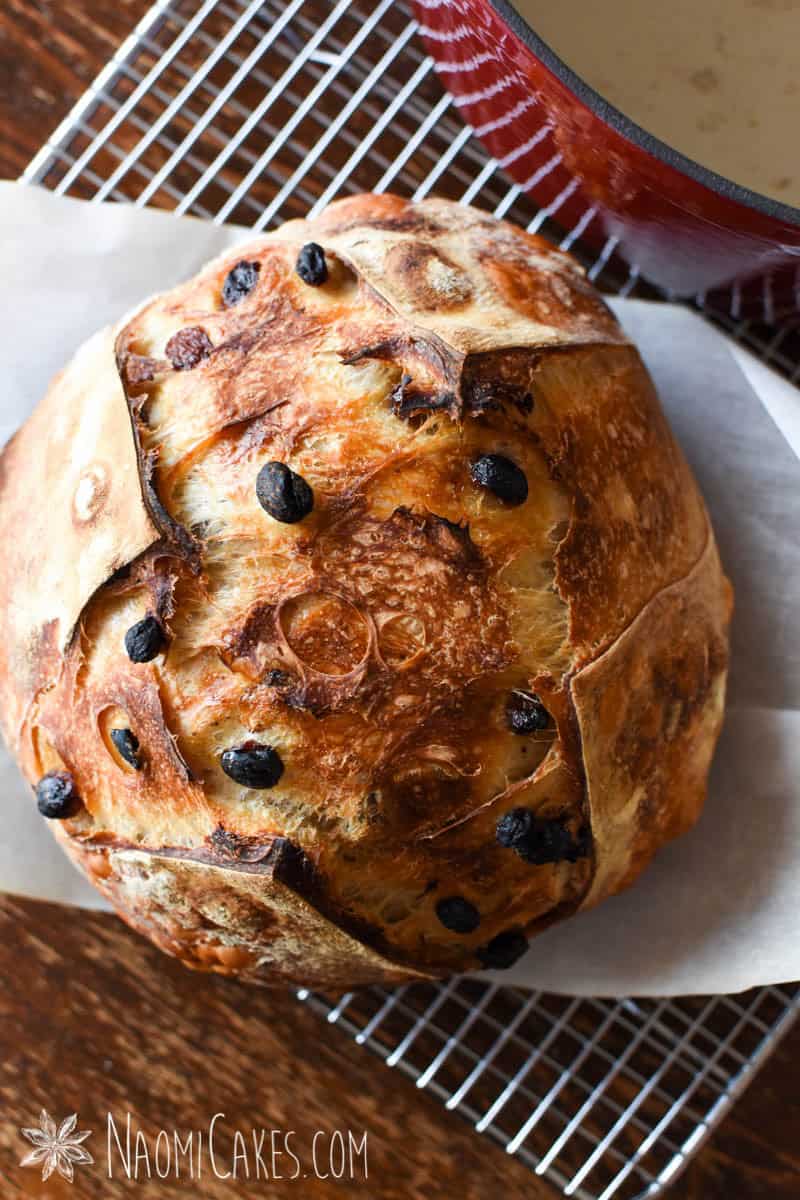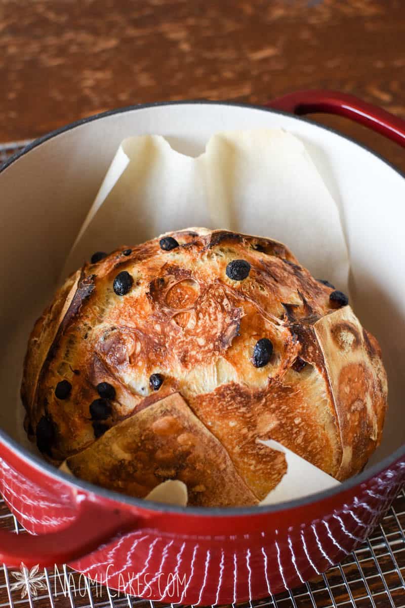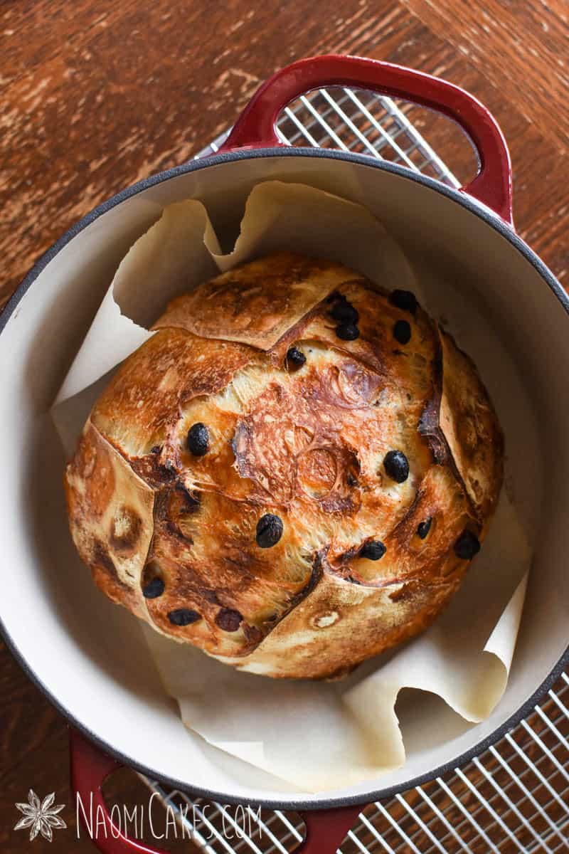 4. Remove the lid from the dutch oven, and allow the bread to bake 10 minutes more, just to brown it. Repeat with the second loaf, or save it for the next day to bake it fresh. Cool fresh bread on a wire rack. For best results, cool the bread completely before slicing into it. Remove and discard any loose, blistered raisins on the surface.
