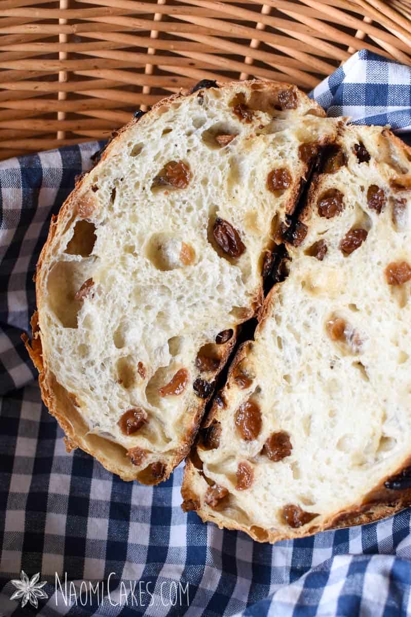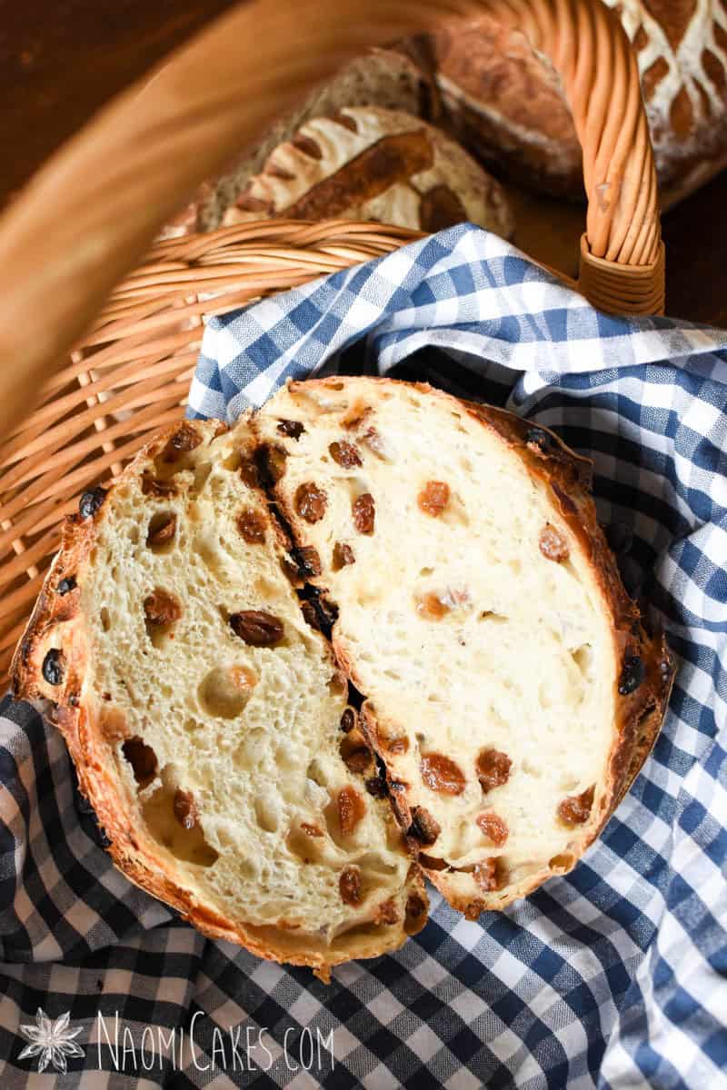 Unlike sourdough cinnamon raisin bread, this recipe is made with just raisins (rather than added cinnamon and sugar) for its sweet flavor. It feels less like dessert, and more like a perfect breakfast with its rich, soft inside texture and crunchy outer crust.
