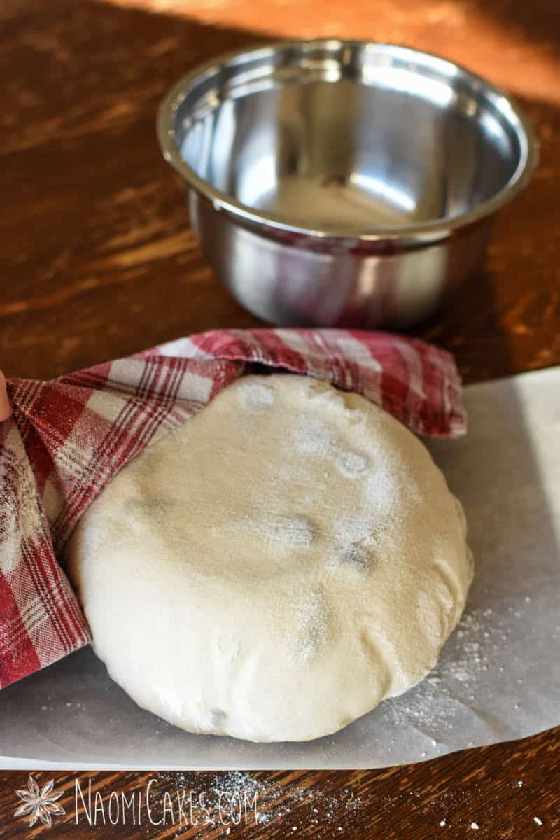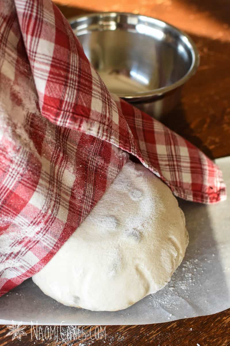 Once the dough has been stretched and folded and its texture is nice and smooth, it can bulk ferment. This process is exactly how sounds as well; you’ll keep your dough covered with a damp tea towel, plastic wrap (or in a pinch, a plastic bag) until the dough has doubled (or nearly doubled) in bulk. This process of letting the dough rise should take about 3-5 hours.