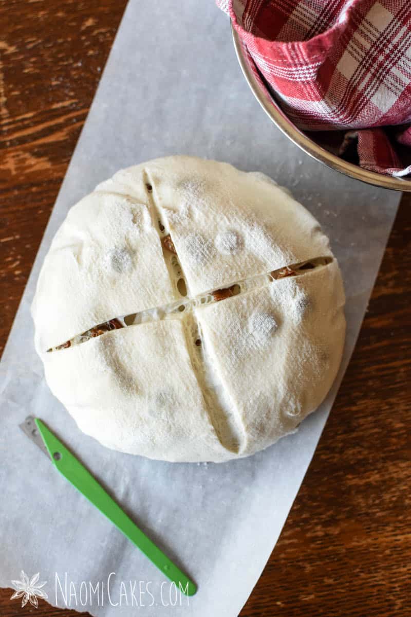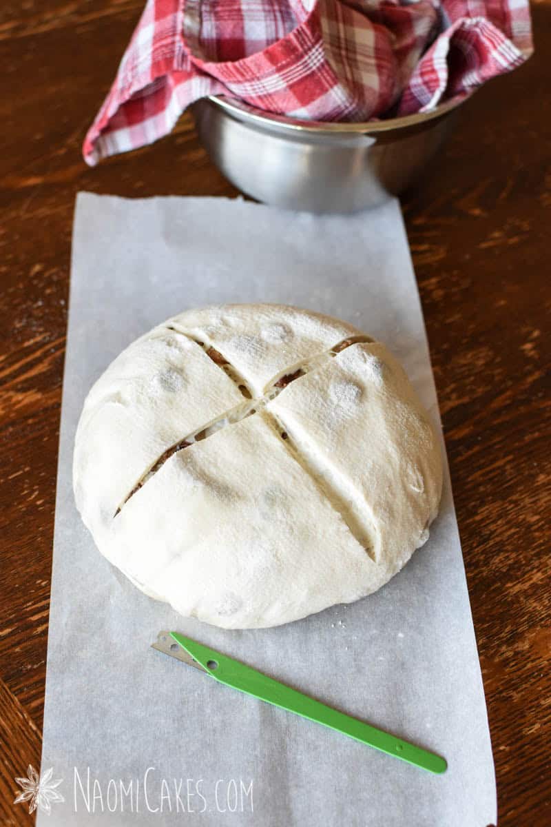 2. Uncover the bread and remove the plastic wrap. Turn out onto a sheet of parchment paper, and score with a sharp knife or razor blade as desired.