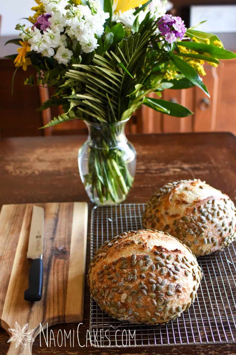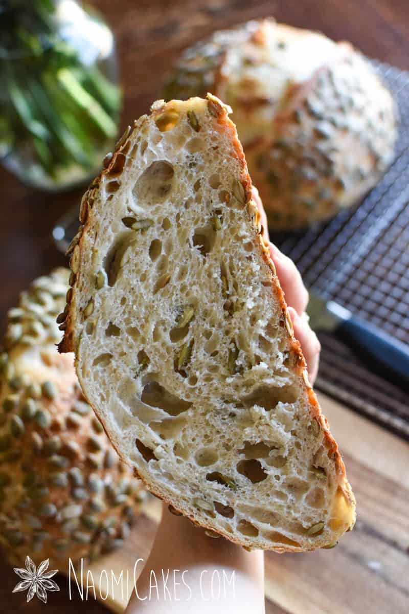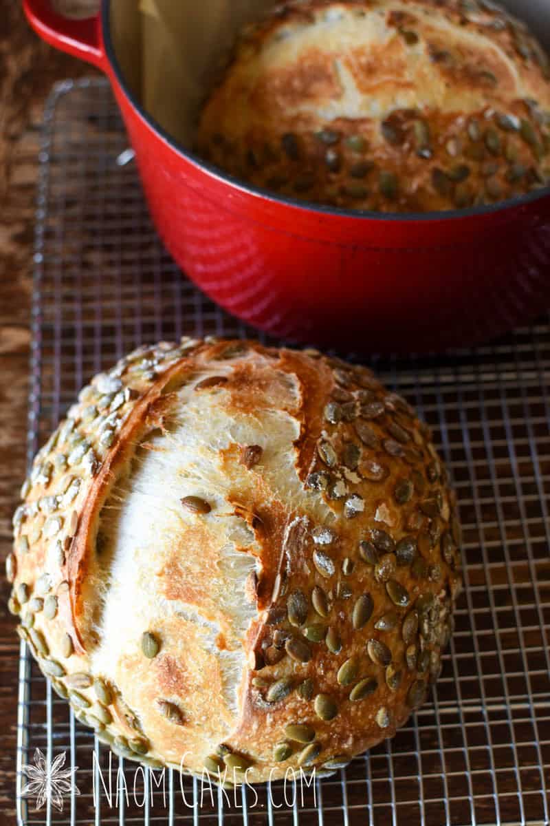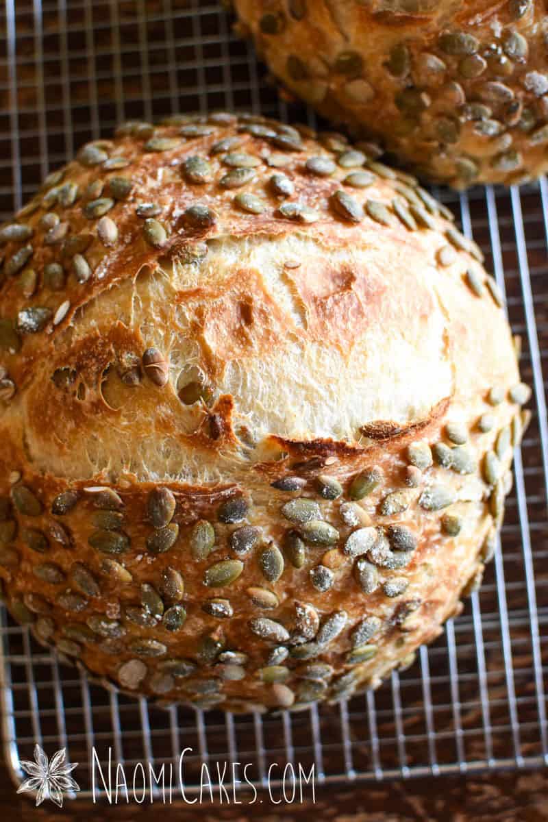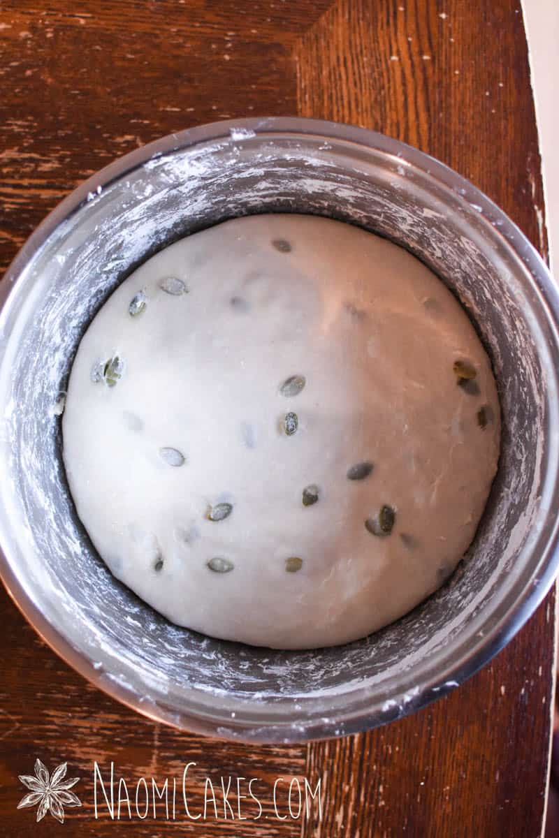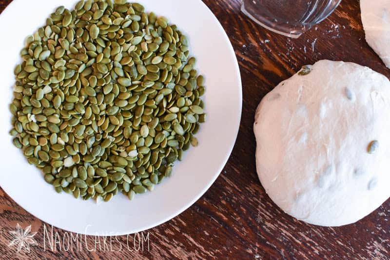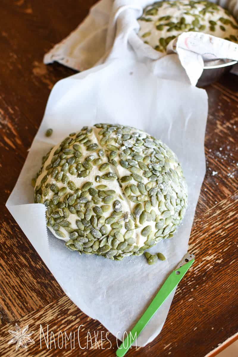 For this recipe, you can easily add some whole wheat flour or rye flour (about 1/2 cup to 1 cup/70g-140g) for 2 loaves, or substitute the pumpkin seeds for sunflower seeds or another type of seed (sunflower seeds yield the most similar flavor for this recipe). Sesame seeds are a delicious seed to roll your loaves in as well.