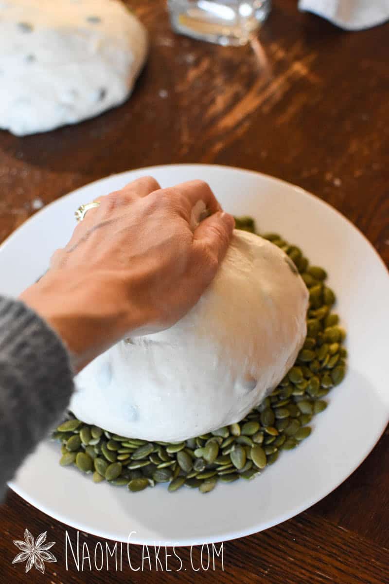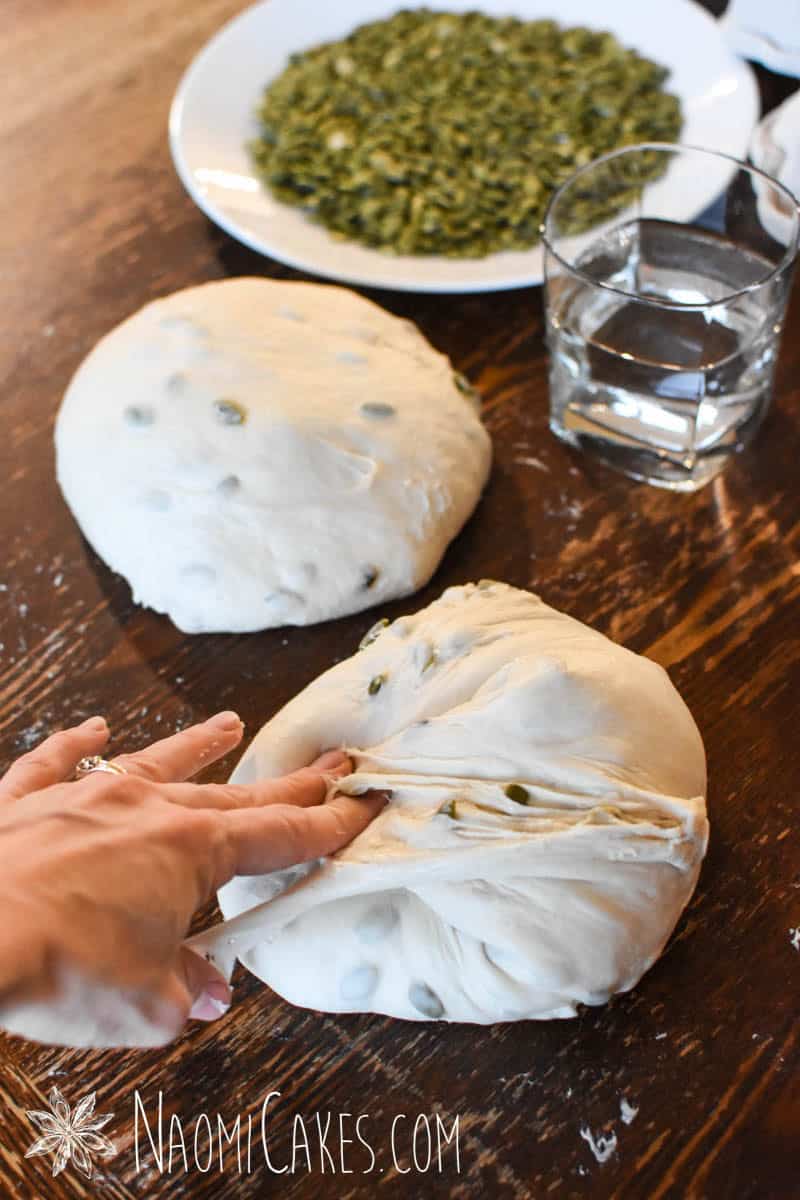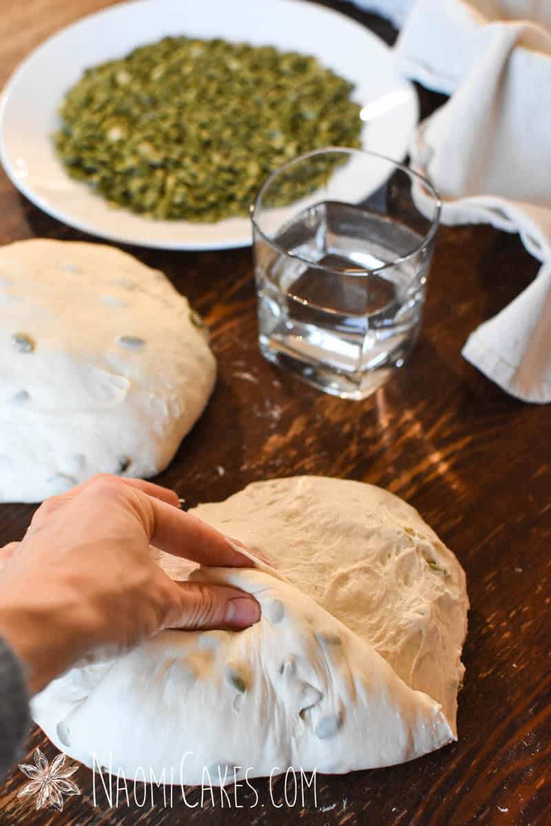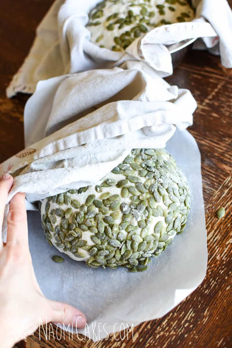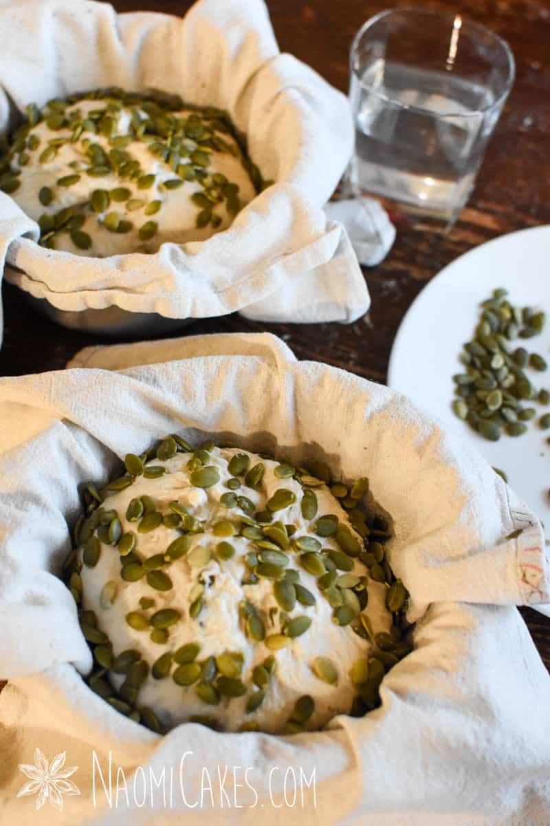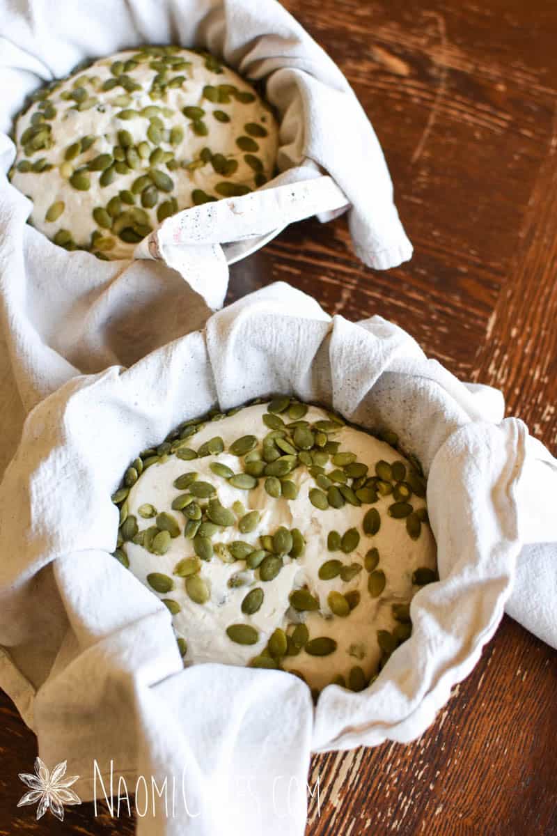 - For the final shape, form each loaf by stretching the edges into the centre and rolling into a smooth loaf. Pat the outside of each loaf with a paper towel dipped in water to make the surface of the dough sticky, and then roll the loaves in pumpkin seeds. Turn into a floured and lined banneton basket for the second rise.