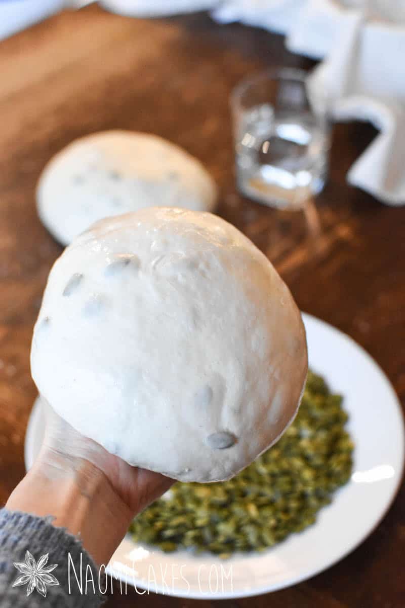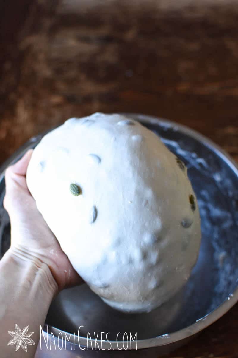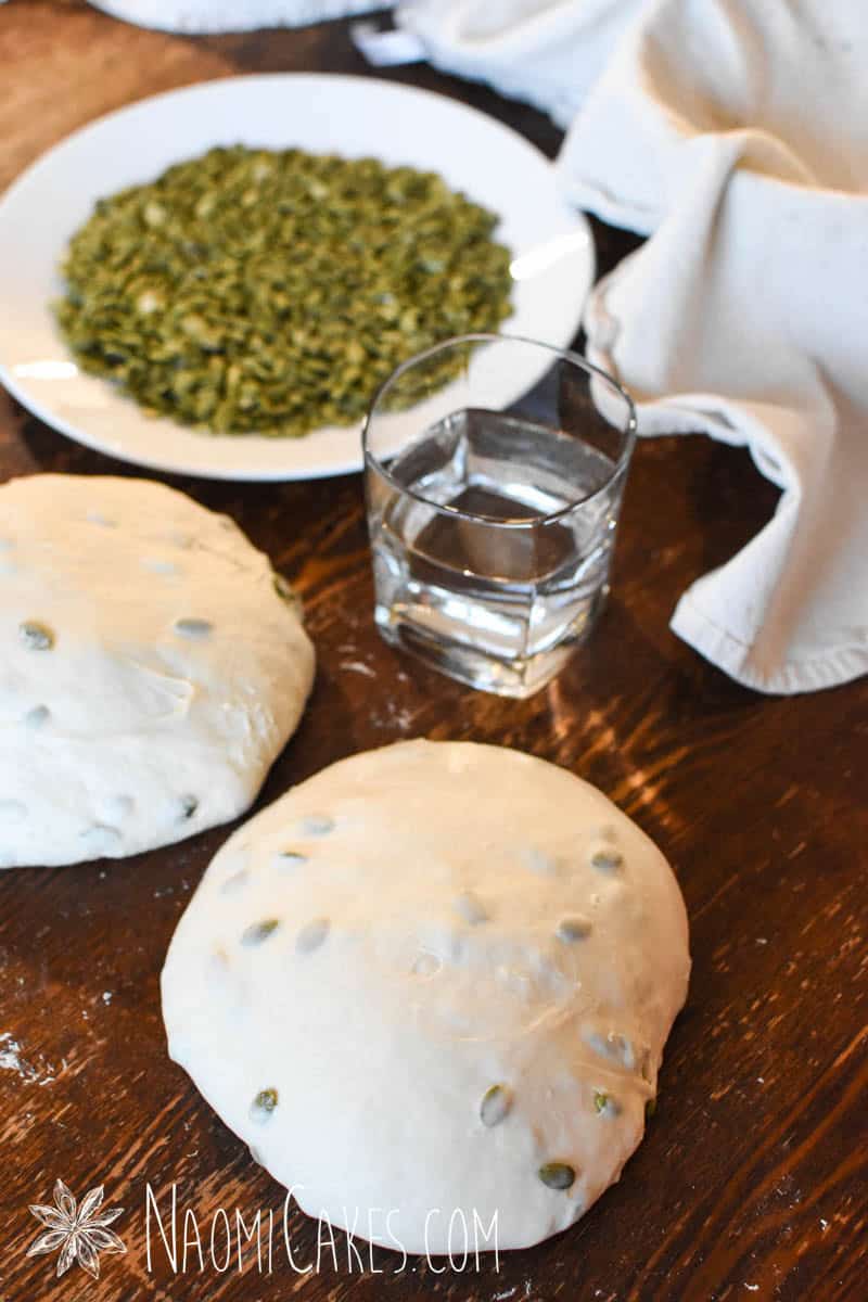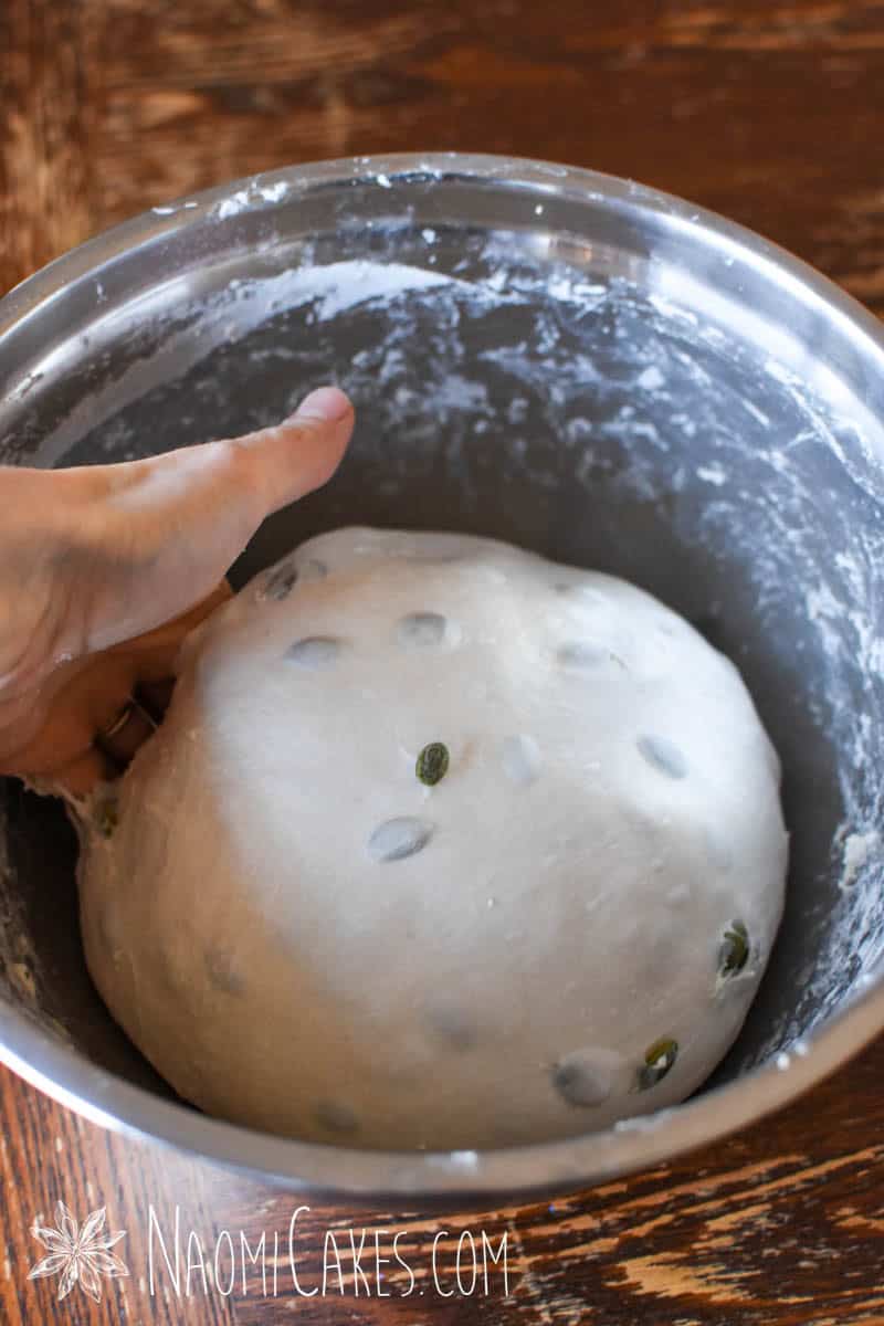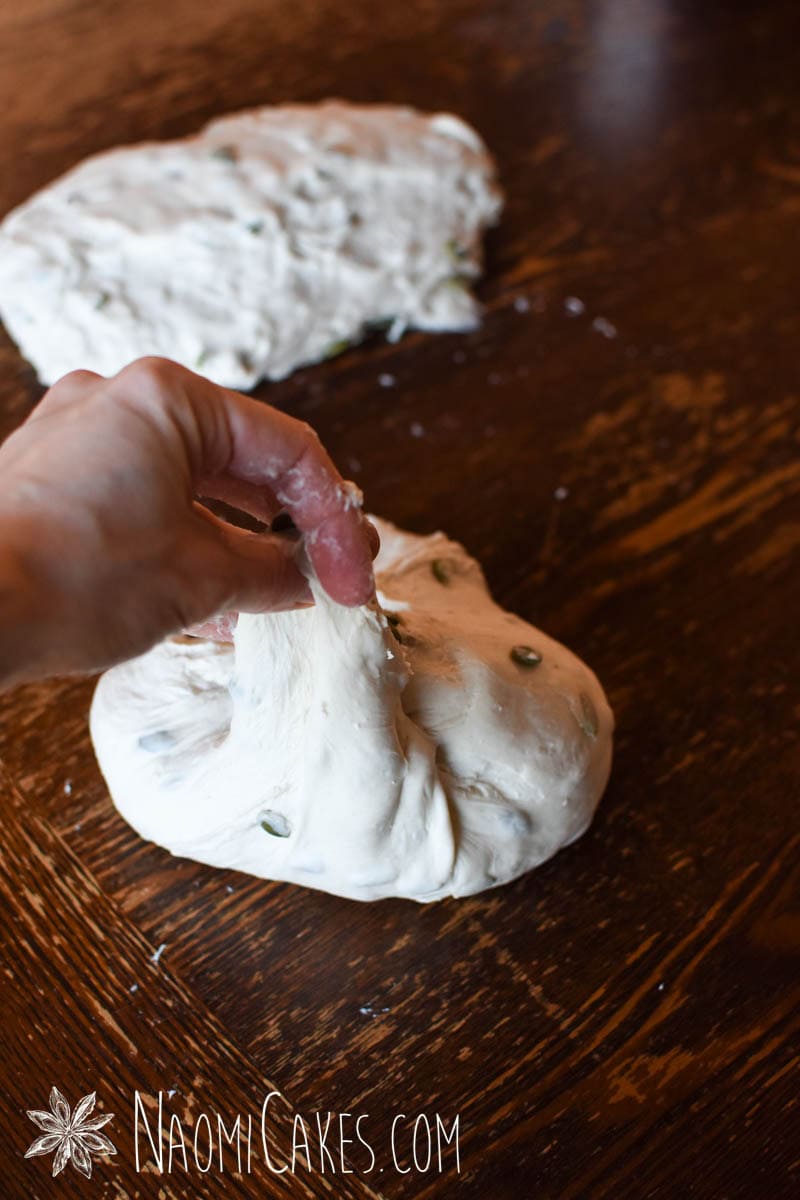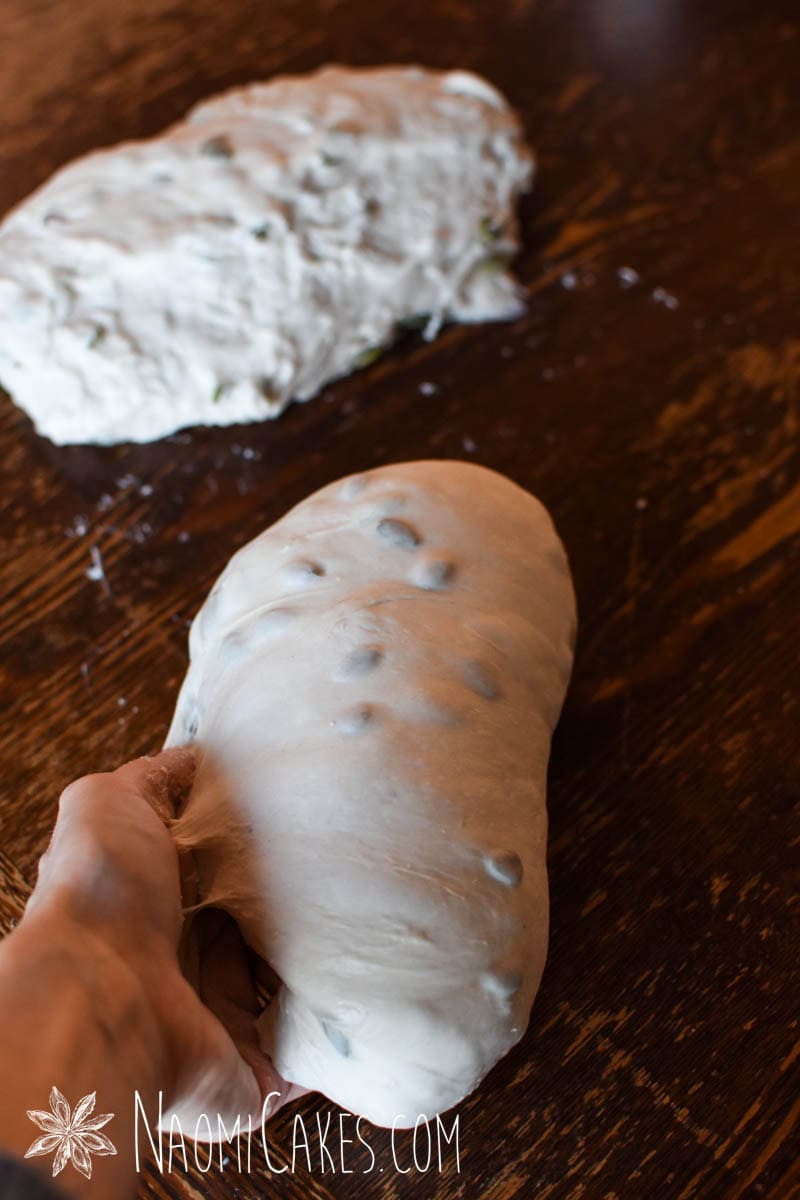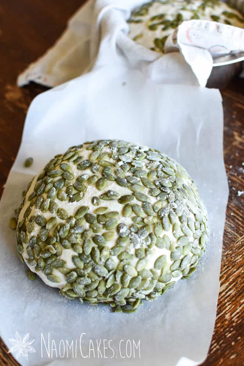 - For the final shape, form each loaf by stretching the edges into the centre and rolling into a smooth loaf. Pat the outside of each loaf with a paper towel dipped in water to make the surface of the dough sticky, and then roll the loaves in pumpkin seeds. Turn into a floured and lined banneton basket for the second rise.
