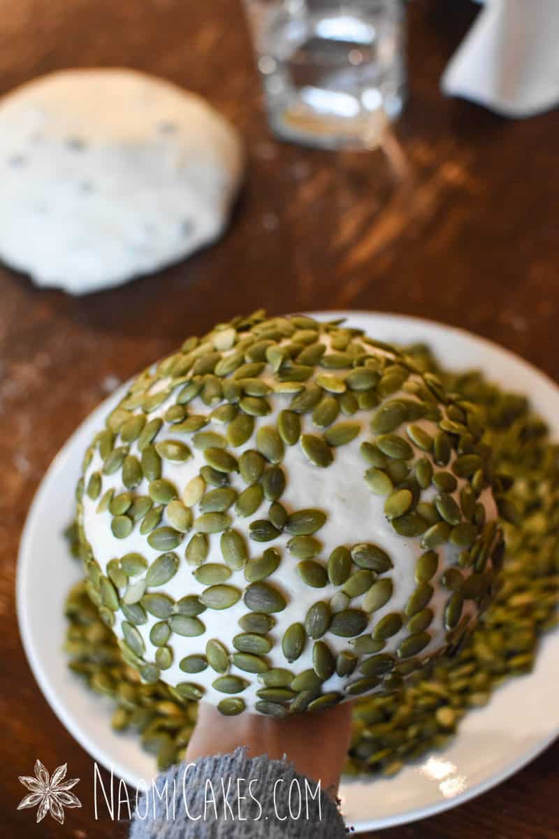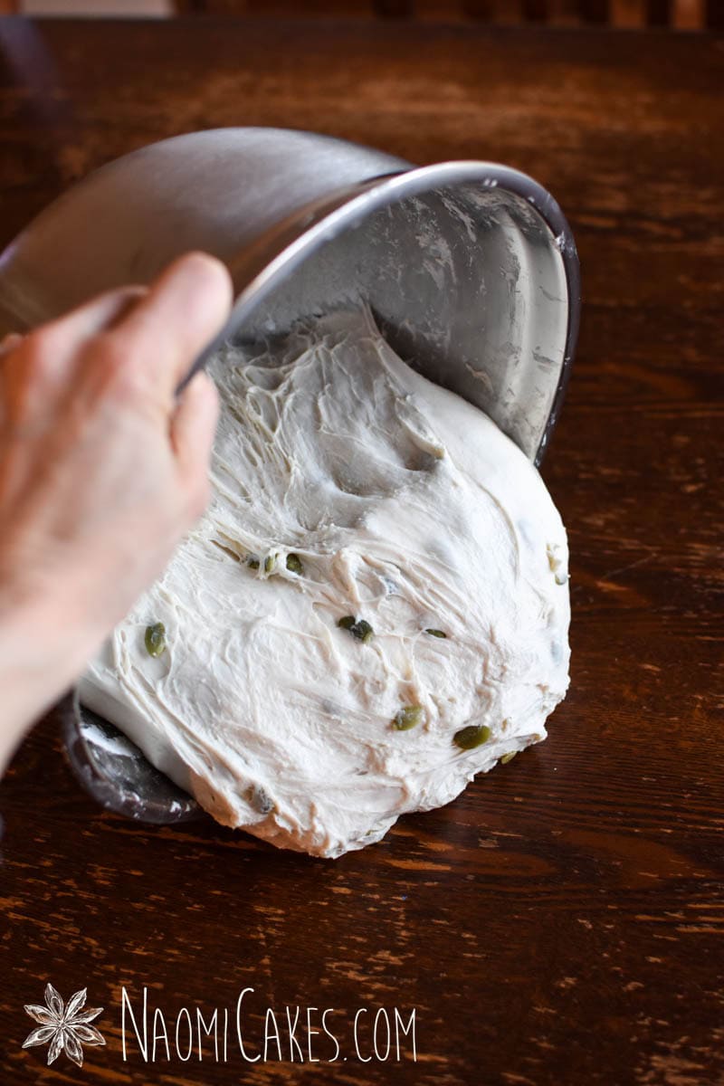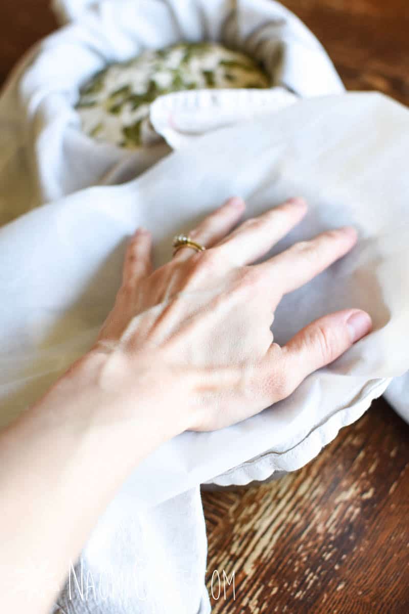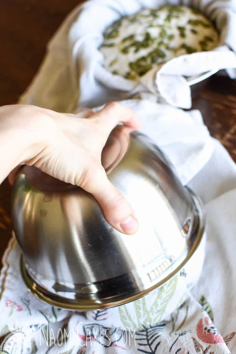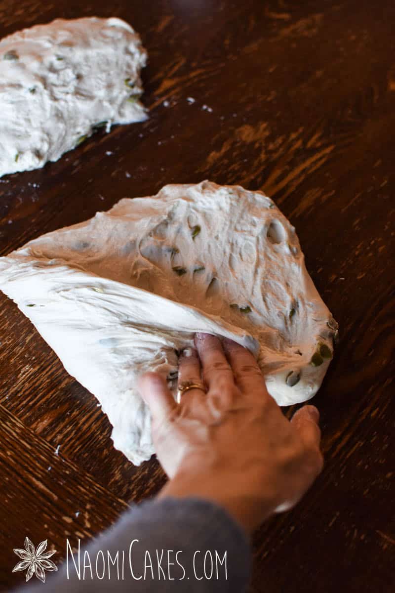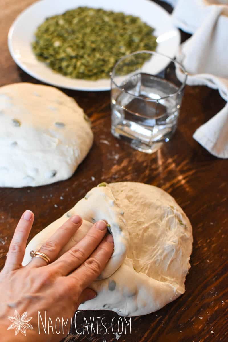 - For the final shape, form each loaf by stretching the edges into the centre and rolling into a smooth loaf. Pat the outside of each loaf with a paper towel dipped in water to make the surface of the dough sticky, and then roll the loaves in pumpkin seeds. Turn into a floured and lined banneton basket for the second rise.
