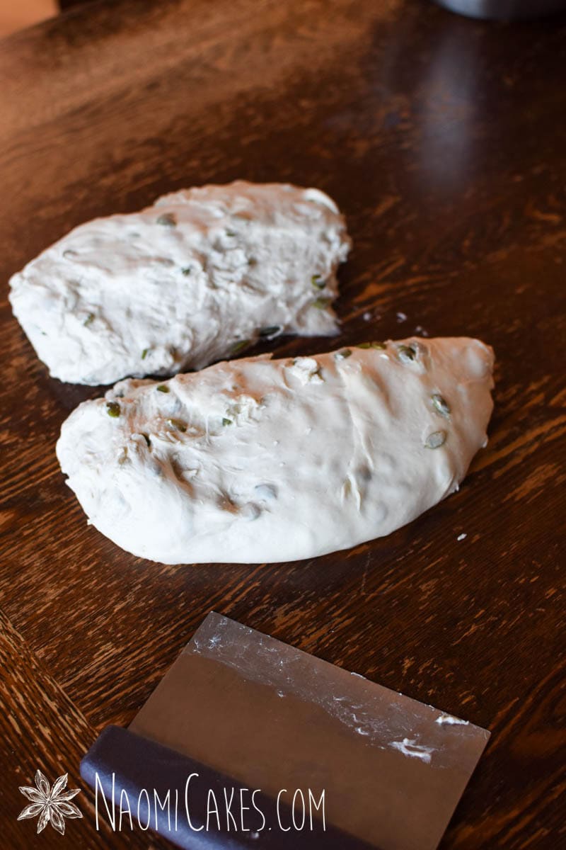 - Turn out onto a work surface, divide the bread dough into 2 portions, and roughly shape each portion into a loaf shape. Cover again, and allow to rest 20-30 minutes more.