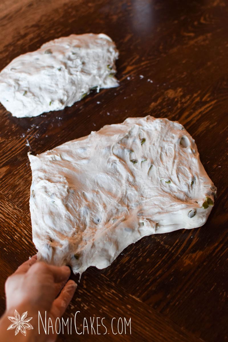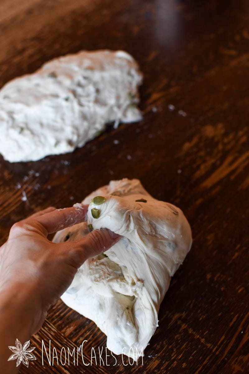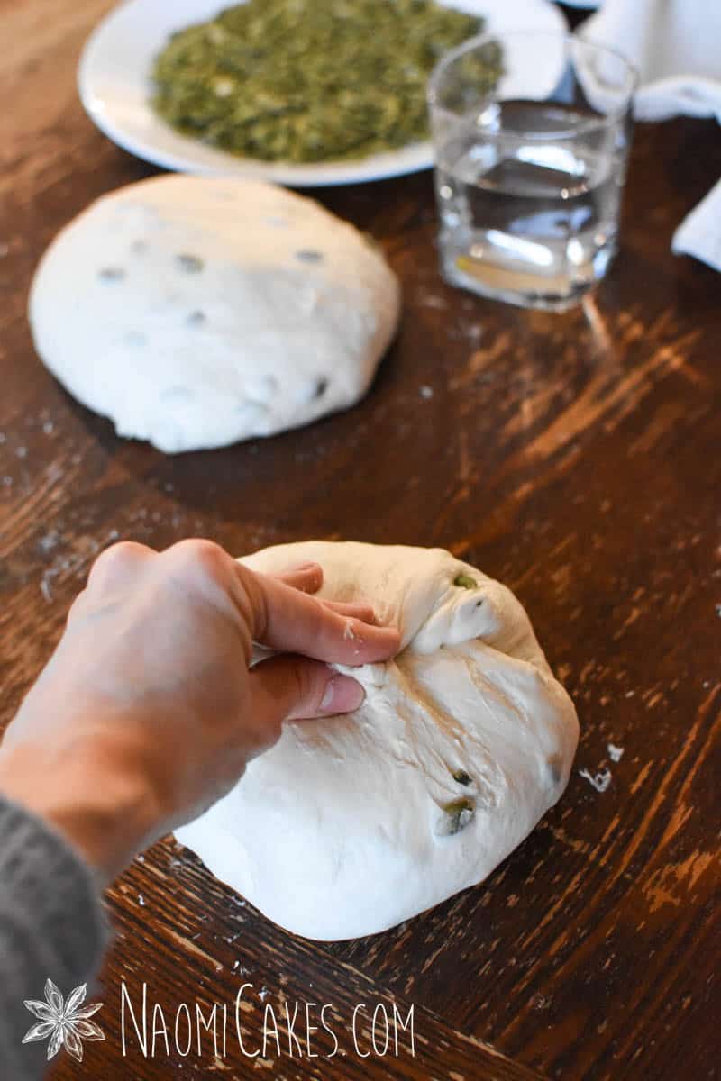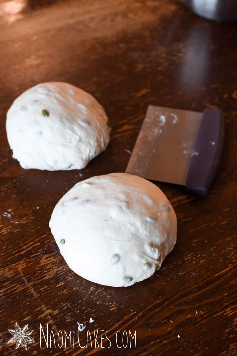 Turn the dough out onto a clean, unfloured work surface. Divide it into 2 equal portions, and stretch one piece of the dough out into a square. Pull the corners of the the square into the centre, and then repeat “stretching and folding” the edges into the centre (from each corner, about 3-4 more times) until the dough comes together into a smooth ball. Turn upside down, and repeat with the other section of dough. Cover, and allow these to rest 30 minutes.