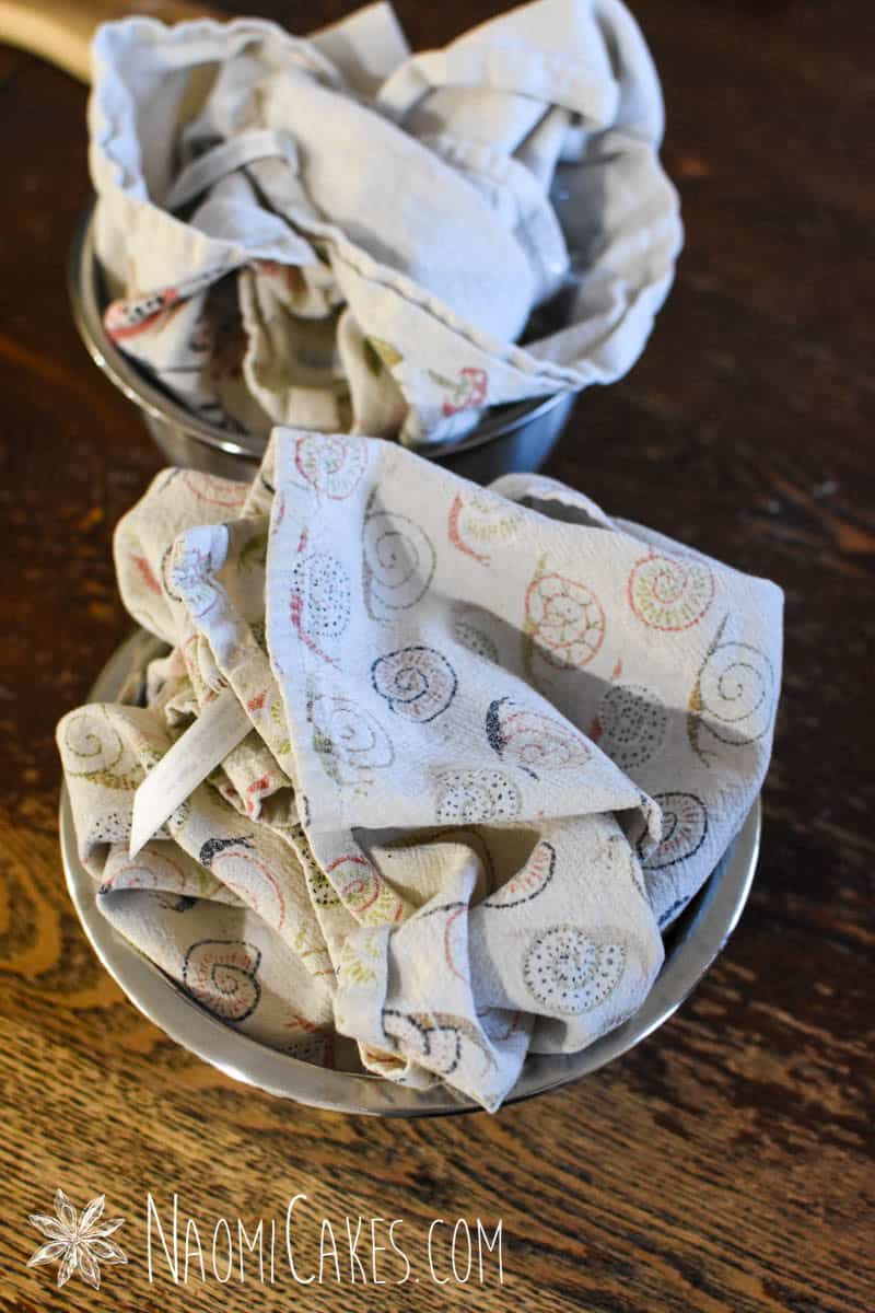 - 2 round or oval banneton baskets or 2, 7″ bowls with tea towels