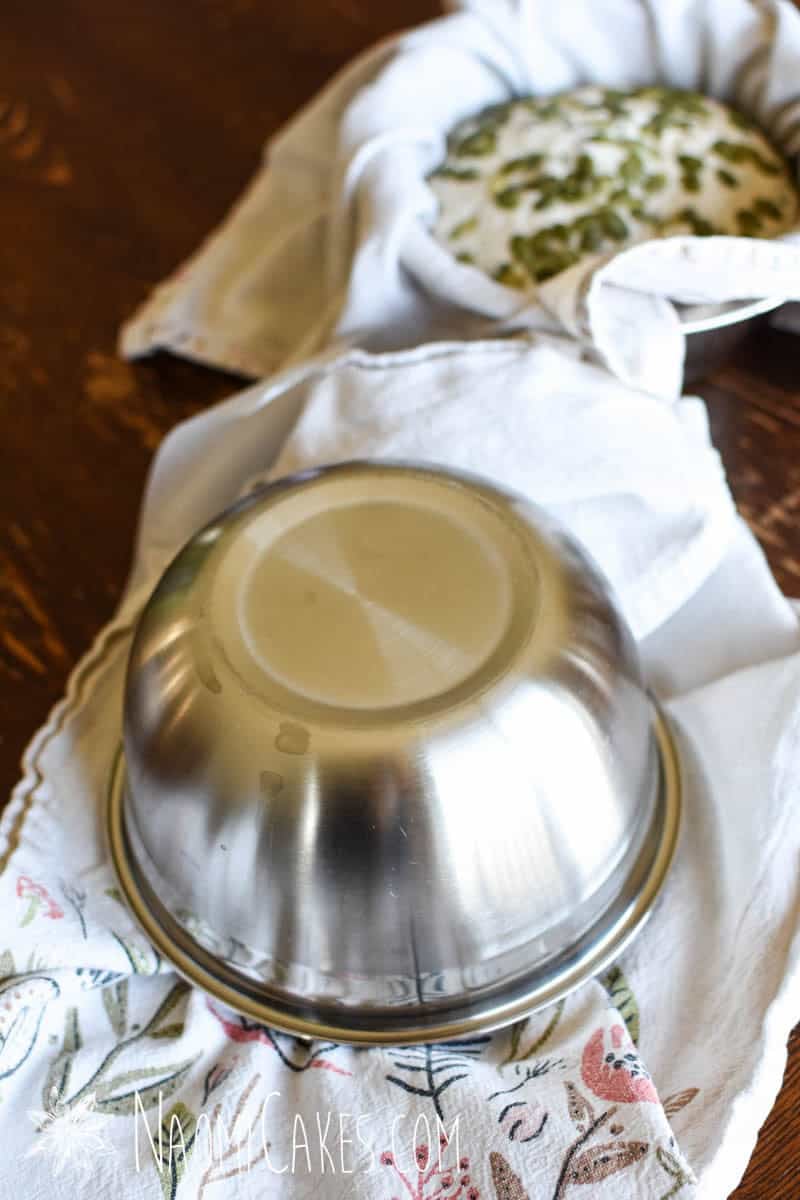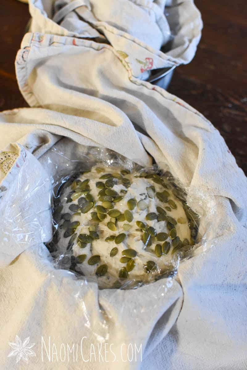Sprinkle the tops with more pumpkin seeds, if desired, and cover with a bit of plastic wrap (optional). Fold the towel over top, and place the loaves immediately into the refrigerator. Allow to rest in the fridge until the next morning.