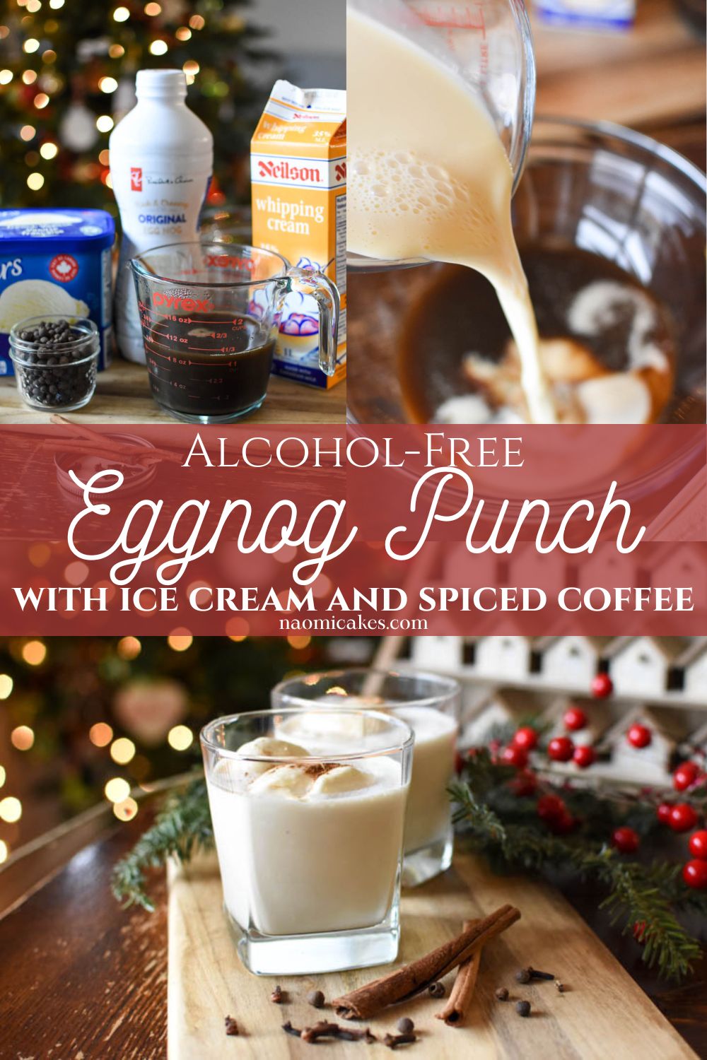 Once those things have been prepared, and you’re ready to serve your eggnog punch, you can combine the coffee mixture, vanilla, eggnog, and whipped cream in a large punch bowl; scoop ice cream over top.