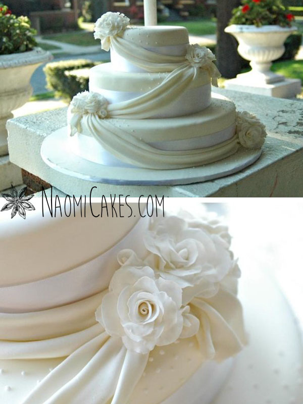 I’ll share a picture for inspiration here. Here’s a wedding cake I made with white rose decorations, made using the method in this tutorial. Also, yes – you can make a cake like this too! (In case you needed someone to say it.)