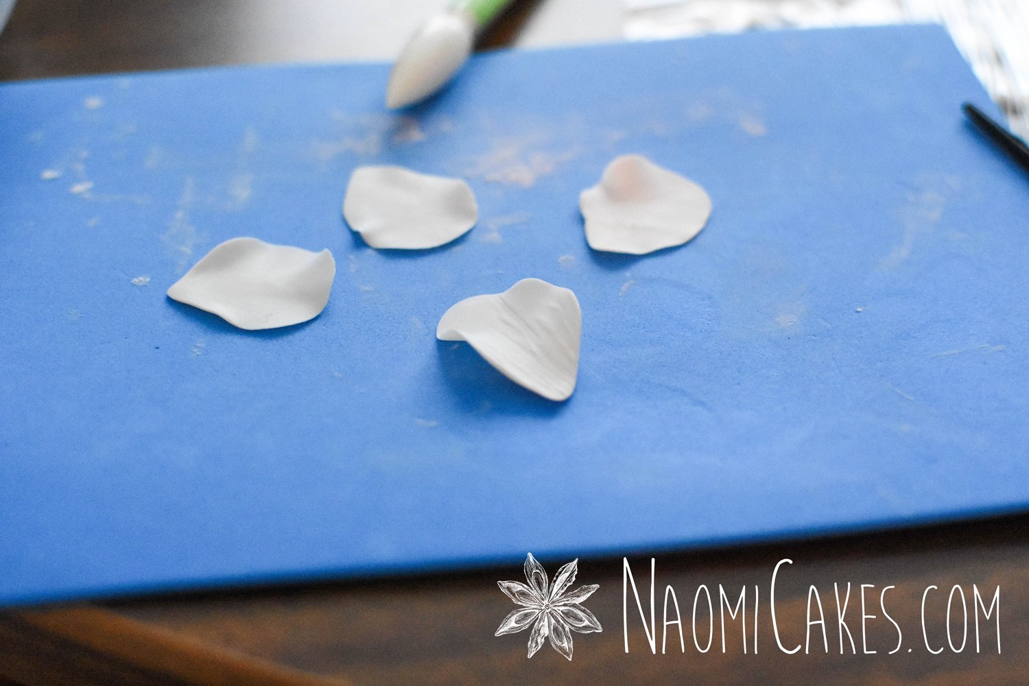Lightly dust your foam mat with cornstarch to prevent the petals from sticking (I like putting it into a little homemade cheesecloth bag to make this most simple). Remove 1-5 petals from under the plastic at a time, and gently thin/frill the edges of each petal with the frill or ball tool (also dusted with cornstarch).