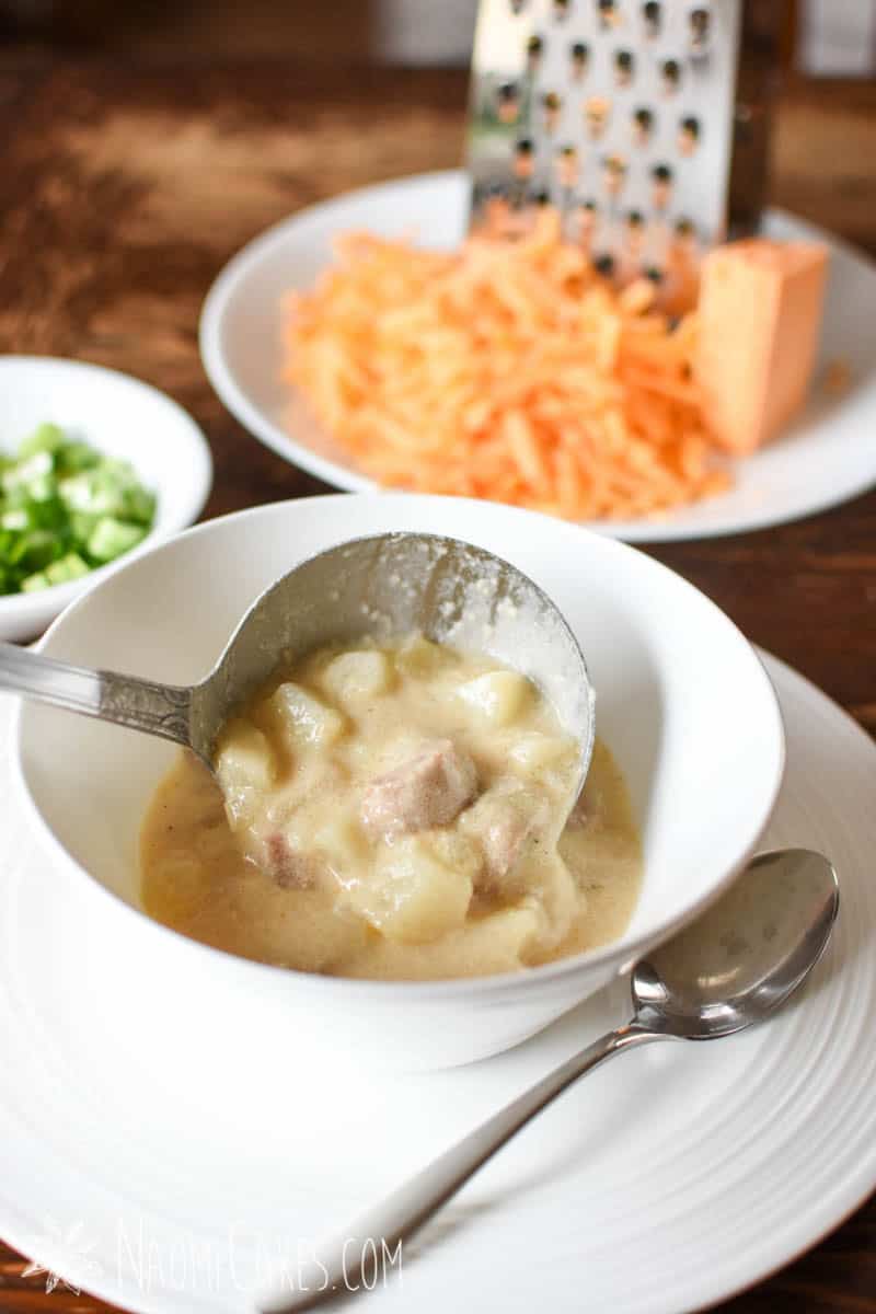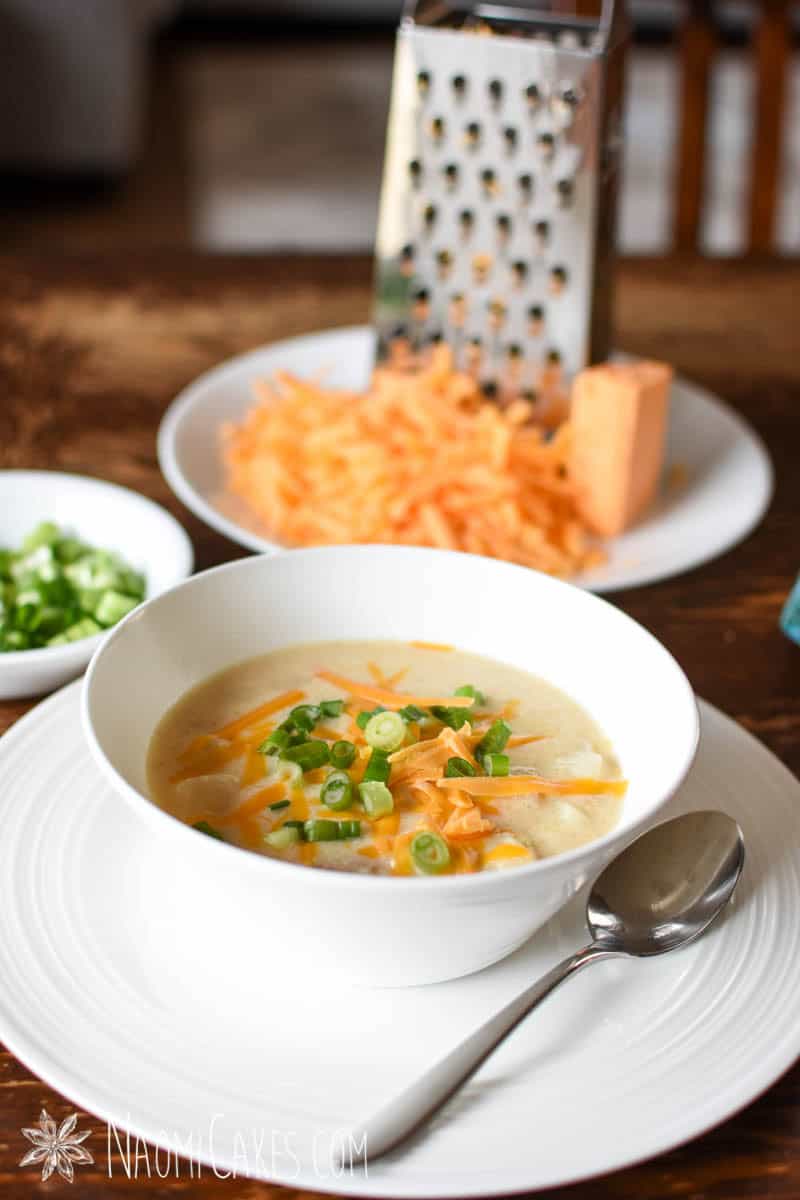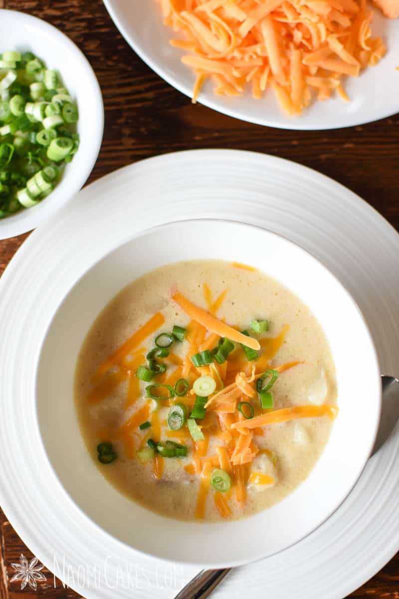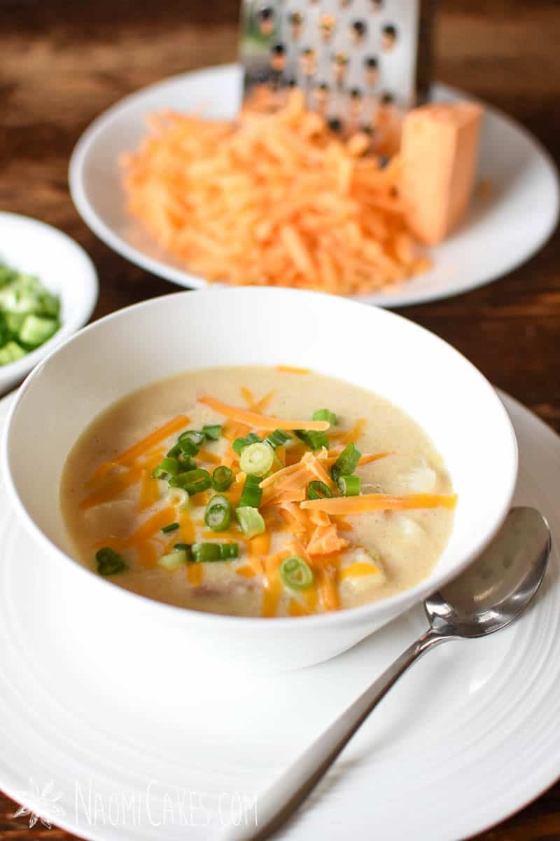 I love to serve this soup with shredded cheddar cheese and sliced fresh green onions on top, and maybe a sprinkling of cracked black pepper or red pepper flakes (if I want a little extra kick).