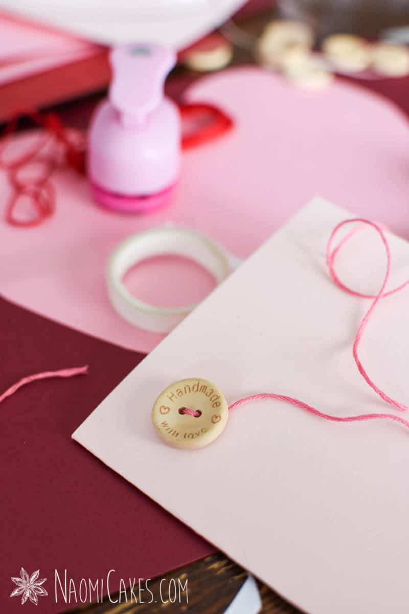 3. 2 “Handmade with love” buttons tied onto the front with red embroidery thread (tied in a knot on the inside of the card)
