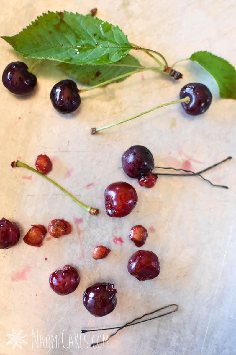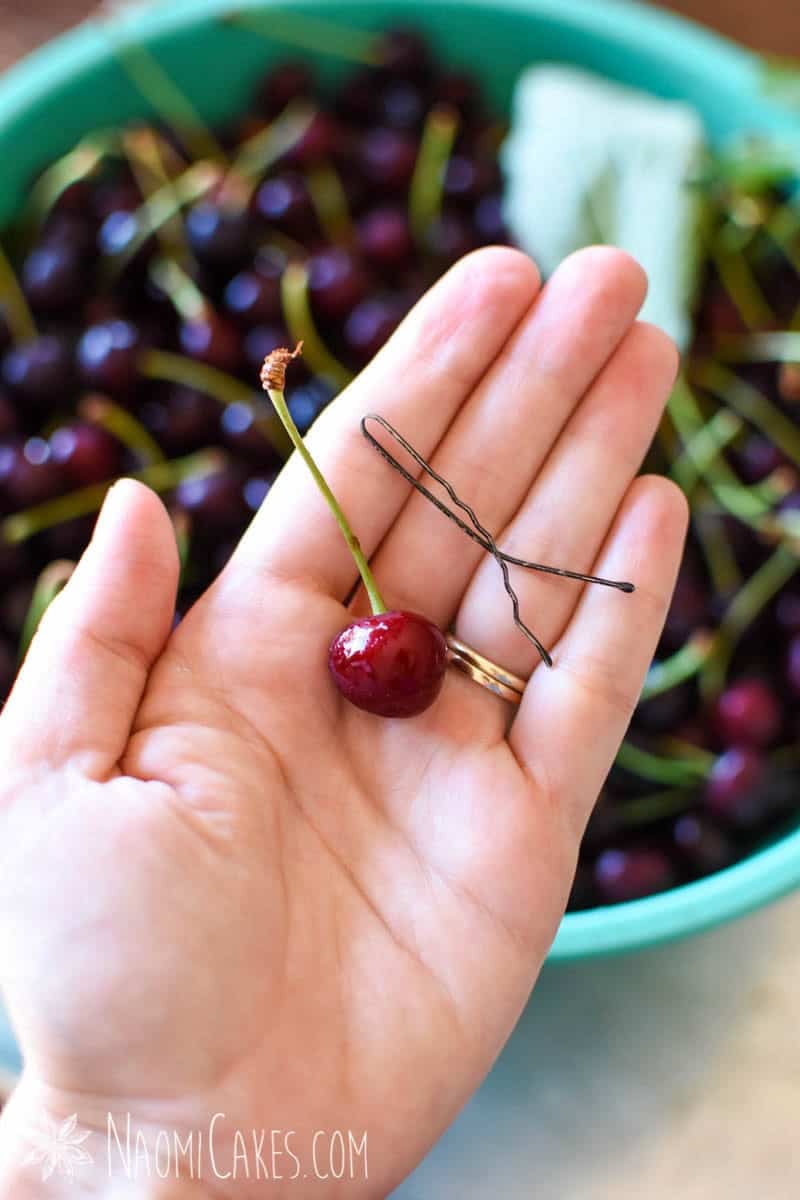 You can make your own cherry pitter with one simple tool: a clean (ideally new) bobby pin! I’ve taken some pictures and included them further on in this post to show you, step-by-step, exactly what this looks like.