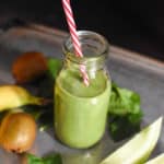 Here is a fruity green treat that is sure to be a favourite: my kiwi honeydew smoothie recipe! Kiwi gives it that tart, zippy, fruity taste, and honeydew is sweet, cool and refreshing. Banana adds a little extra sweetness to offset the kiwi, thickening the whole thing a bit, and then the addition of spinach gives the whole thing some extra nutrition and colour.