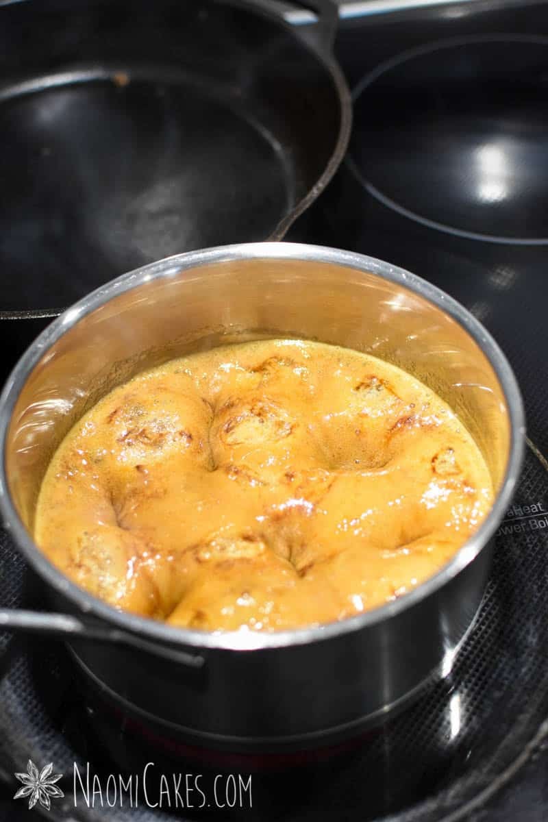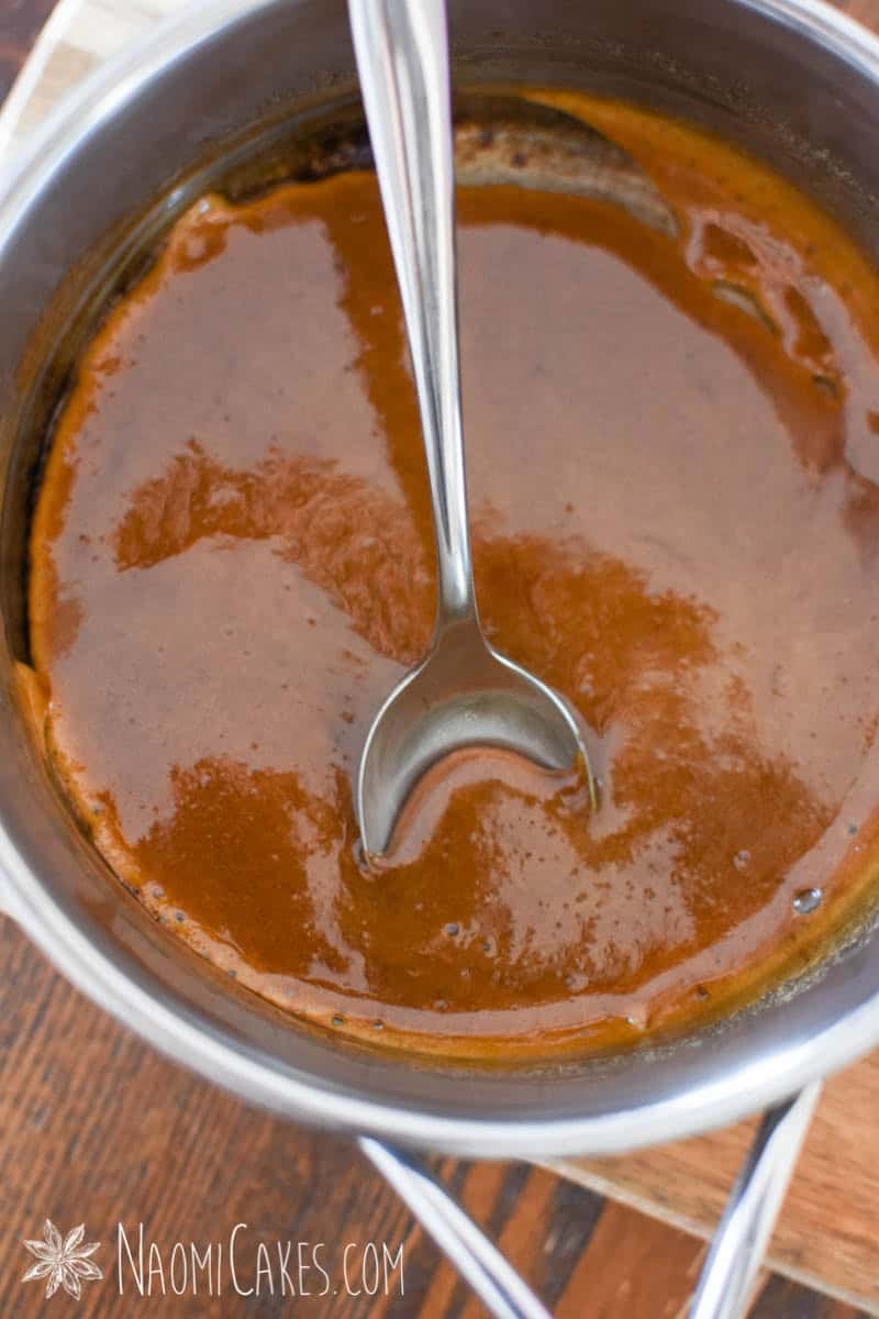 I found that my maple syrup became a much more “blonde” in color as it got hot, and then it appeared thicker and more like caramel as it got closer to temperature. The bubbles formed during the boiling process began to burst into empty holes once the syrup began to get quite thick.