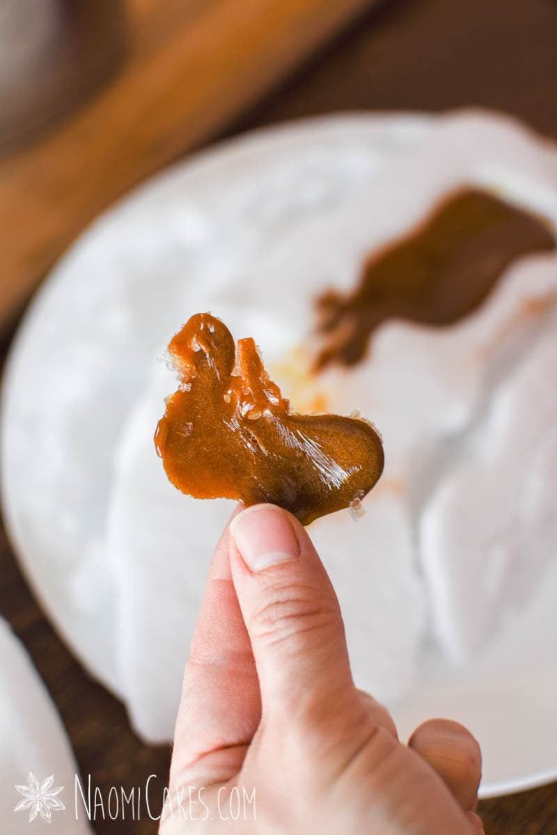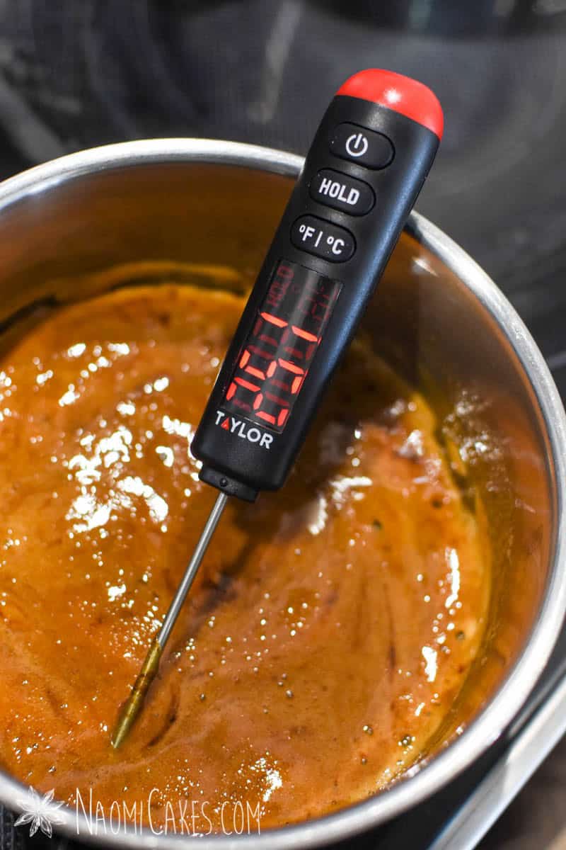 To make this post a little more accurate, I decided to use a digital thermometer to see what temperature the candy would be when it was ready. No surprise, I overcooked mine a little from what I was going for (likely because I was trying to photograph the process, and sugar in the process of cooking just gets hotter by the second)!