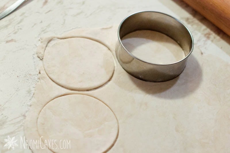 Once the pastry has been able to rest, take about 1/2 of the pastry and press it into a 6″ circle on a lightly floured work surface.