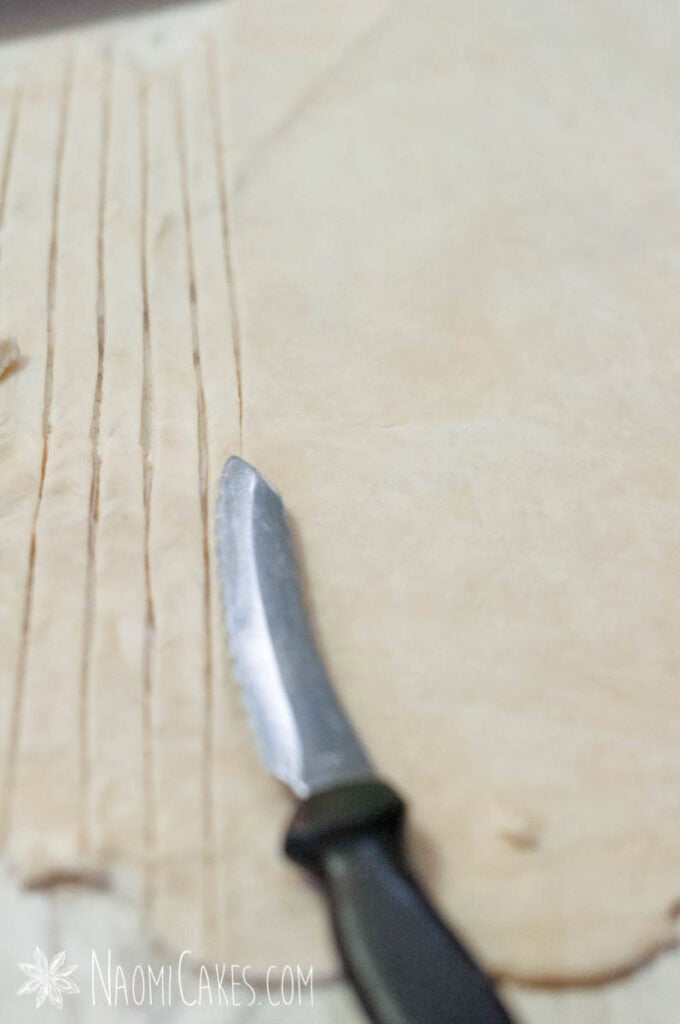 - Roll out another piece of dough and cut into 1/4″ strips. Using your fingertips, moisten the edges of each of the pastry shells with a bit of water, and press the strips onto the dough (as picture below) into an “X” shape, alternating which direction you lay the dough strips. Trim the excess and set aside.