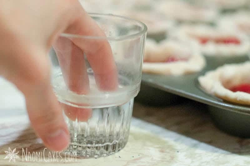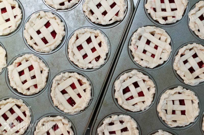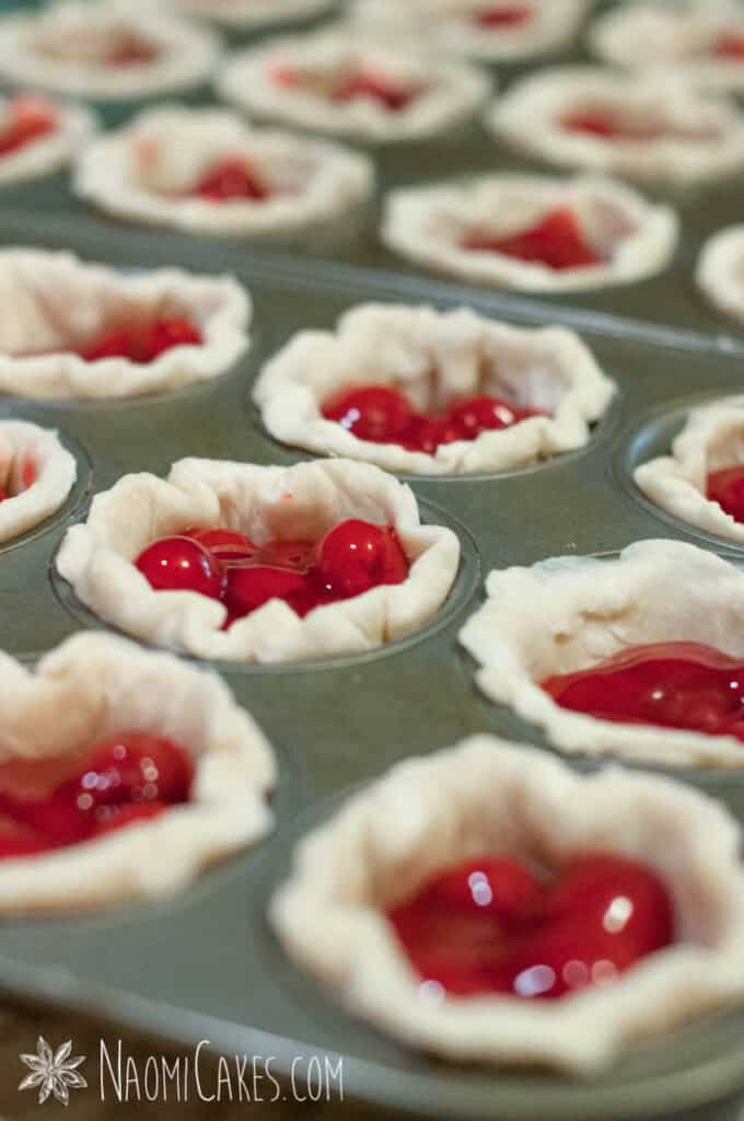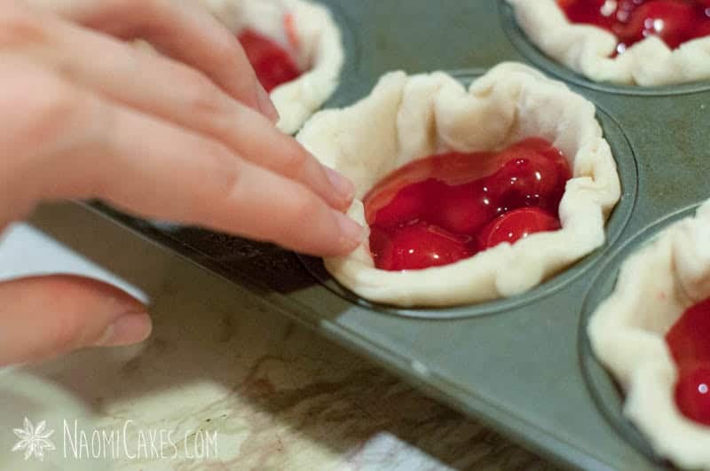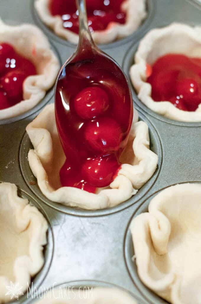 Fill each pie shell with cherry pie filling, taking care not to over fill them (too much filling will make them overflow in the oven and make a mess on your oven and pans). You’ll probably want to get about 4-5 cherries into each pie.