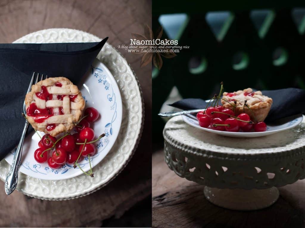 Fill each pie shell with cherry pie filling, taking care not to over fill them (too much filling will make them overflow in the oven and make a mess on your oven and pans). You’ll probably want to get about 4-5 cherries into each pie, as pictured.