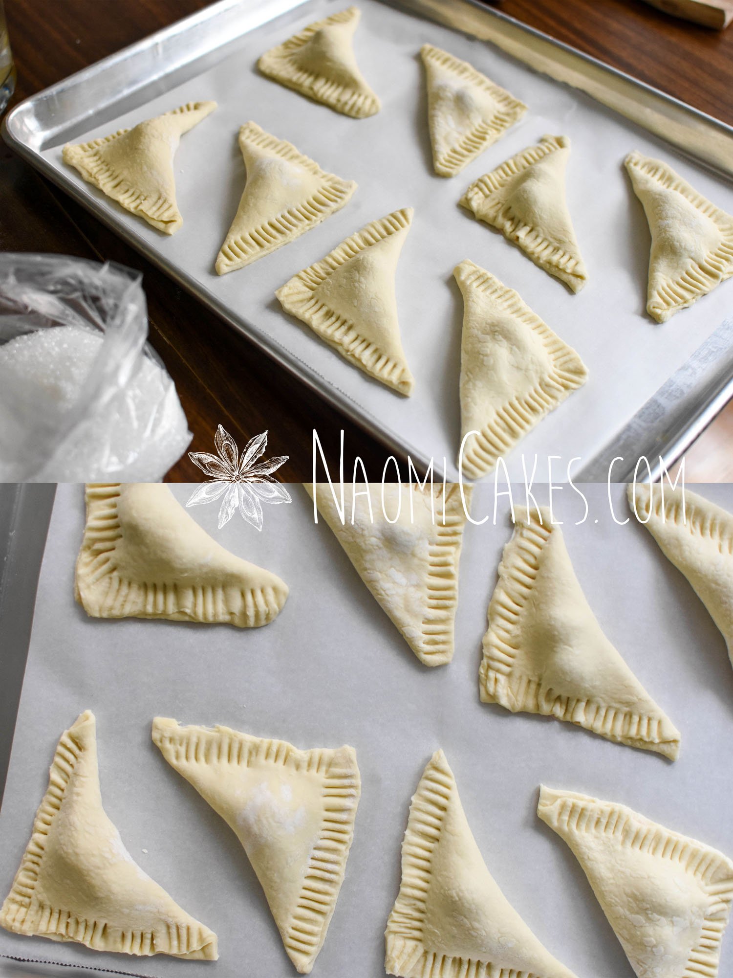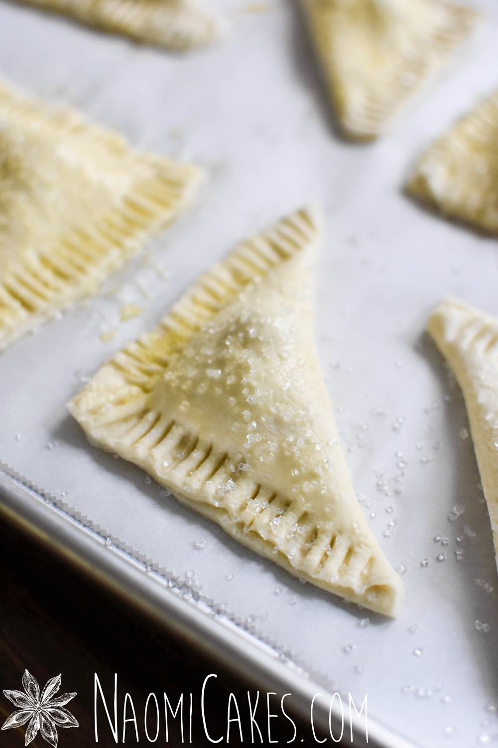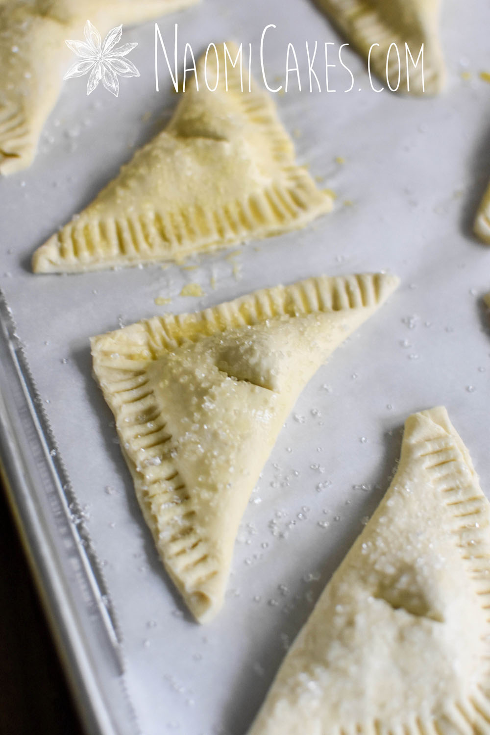 Place the triangle shapes onto prepared pans, brush with egg wash, and sprinkle with coarse sugar. If desired, cut a little slit into the top of the pastry.