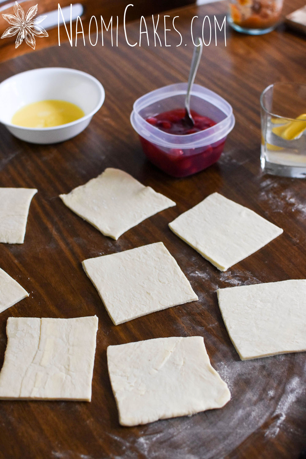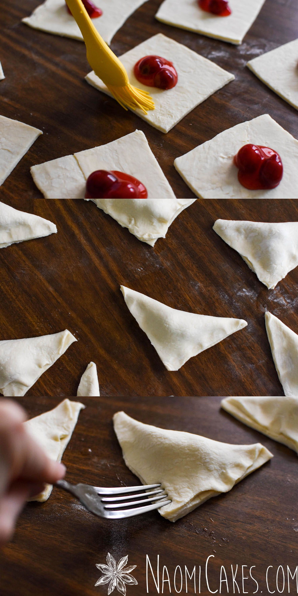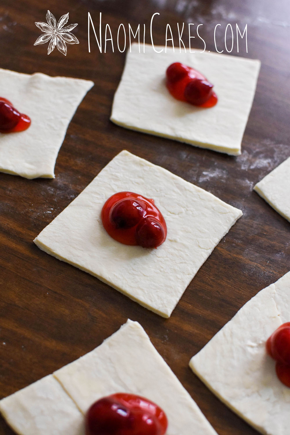 Spoon about 1/2 Tbsp. cherry pie filling (or 1 Tbsp for larger turnovers) into the centre of each square, and brush 2 of the edges with a little bit of water (not too much, just enough to moisten them).