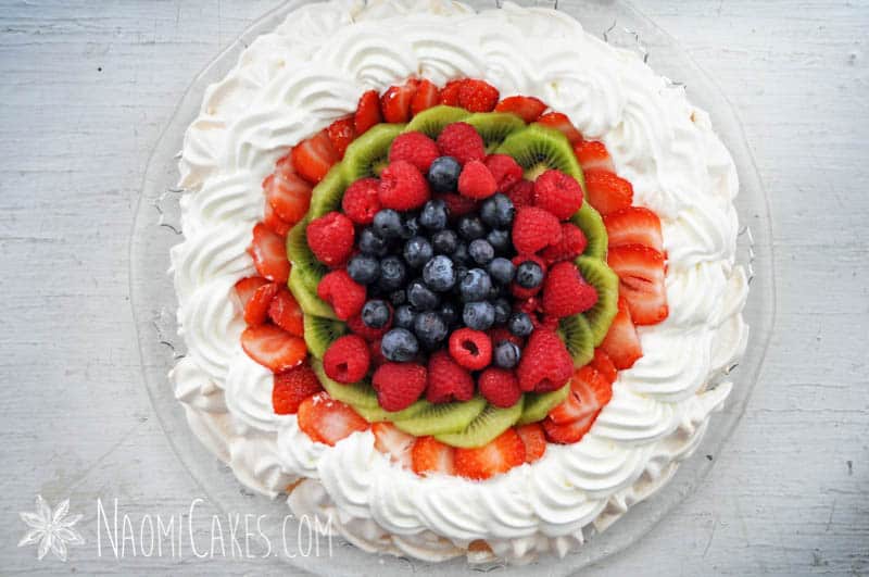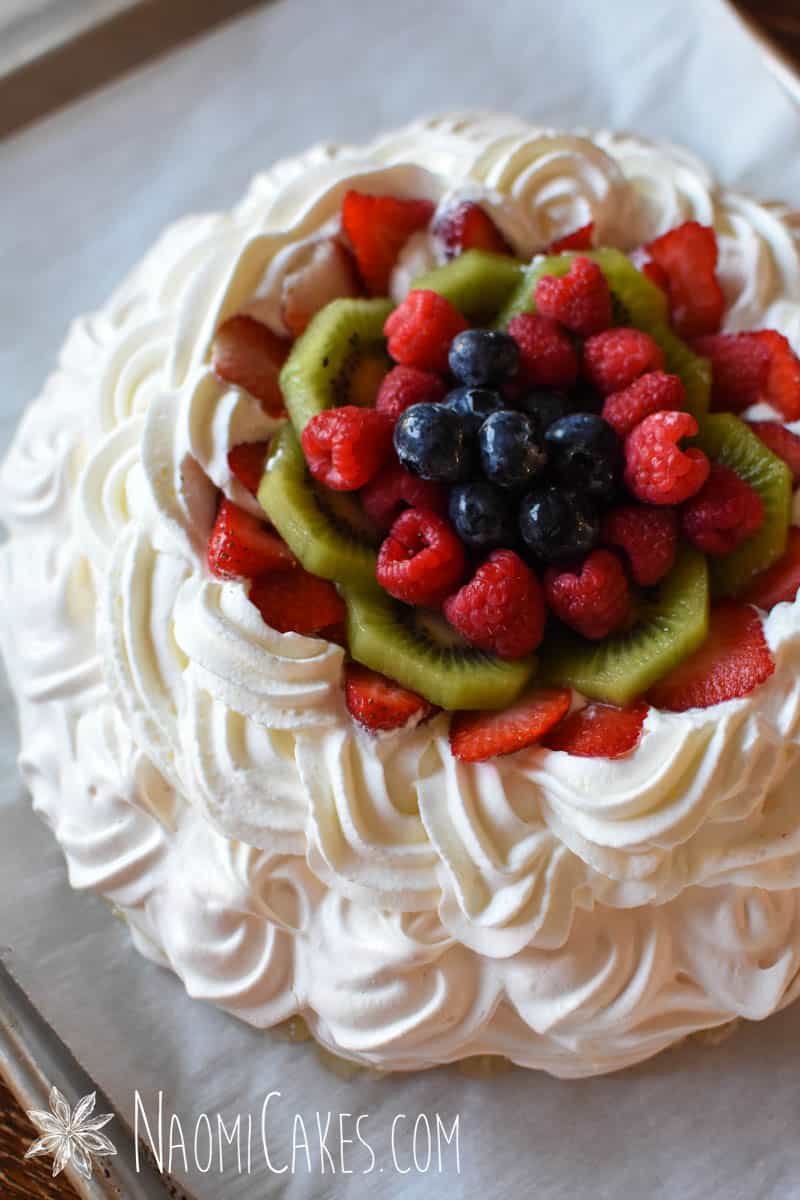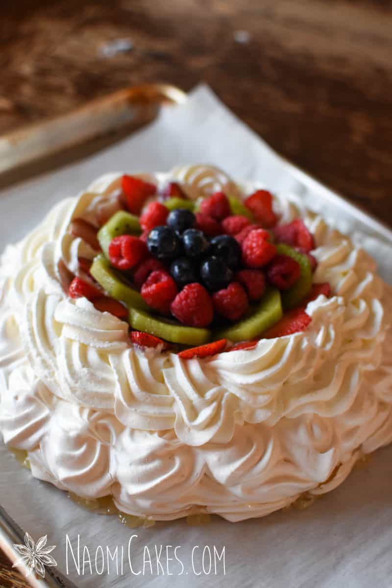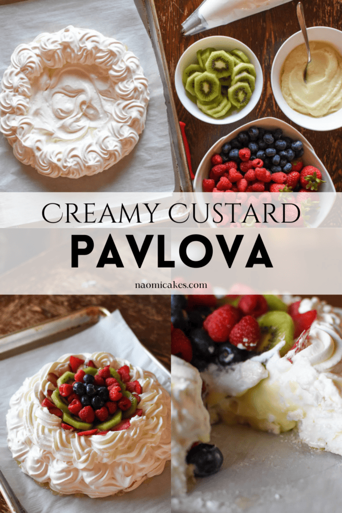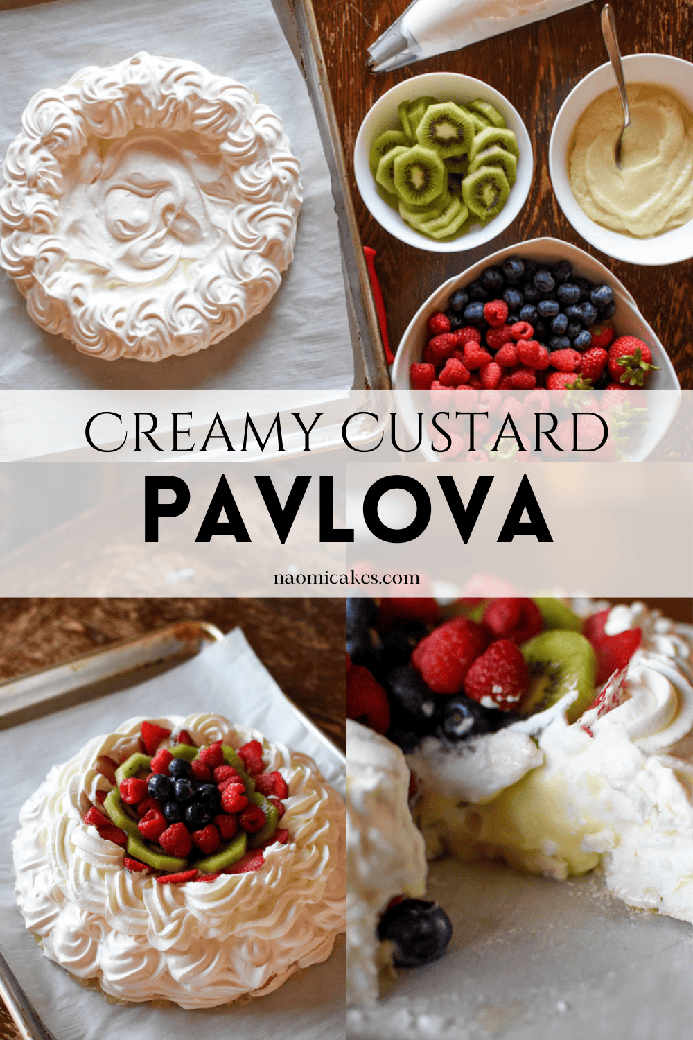 Pavlova is a crisp, sweet meringue shell filled with freshly whipped cream and fresh fruit (or in this version, an additional layer of custard in the middle). If you like meringue cookies, this recipe is the “cake” version of the same thing… but a little extra deluxe with the additional toppings.