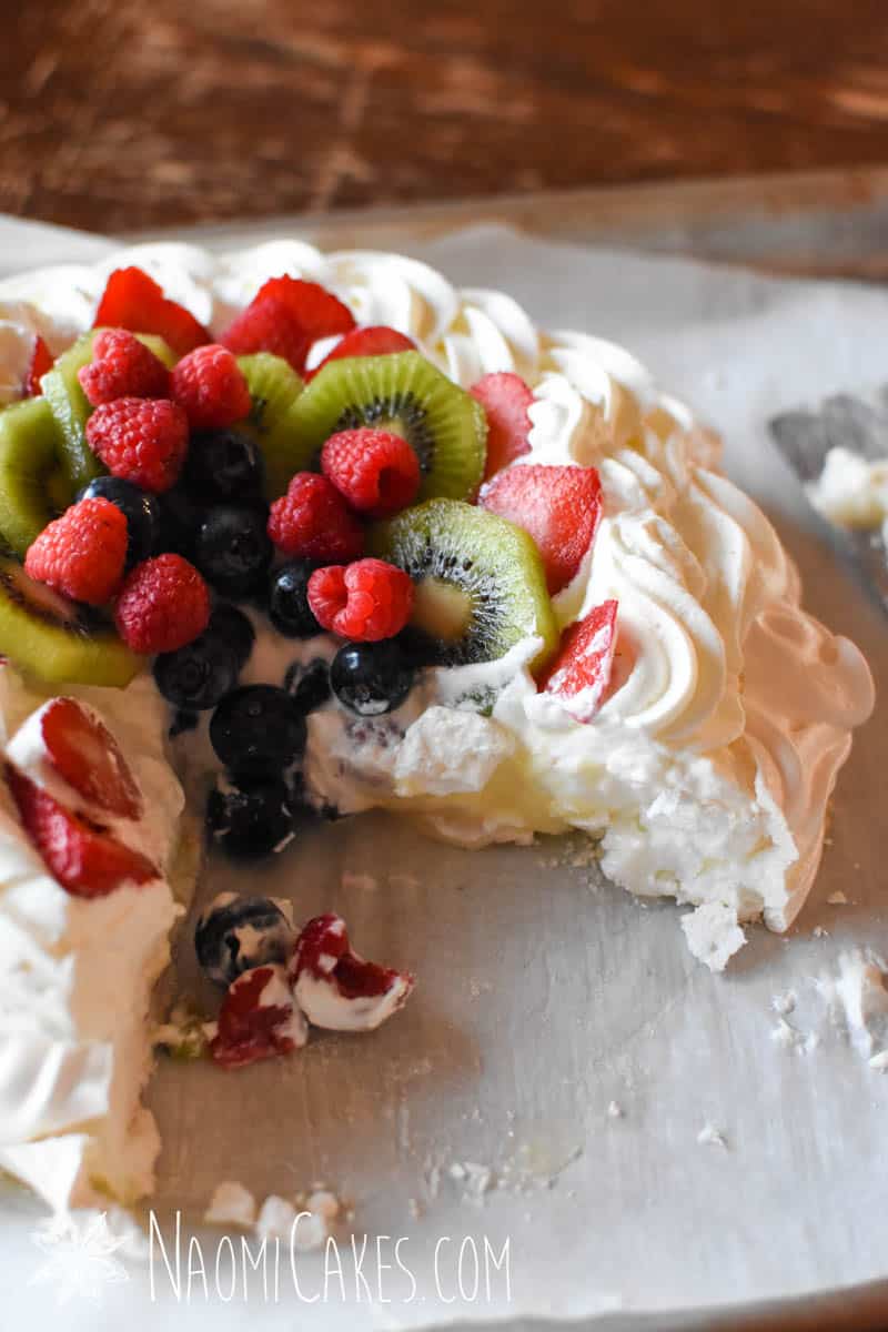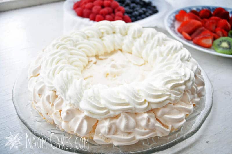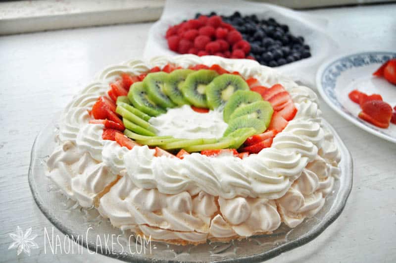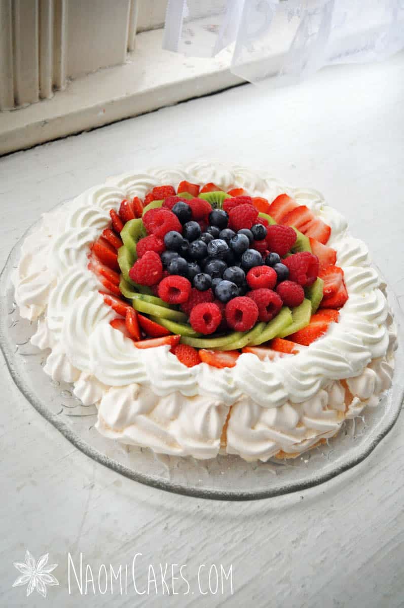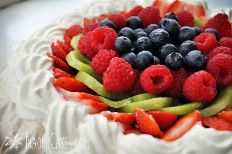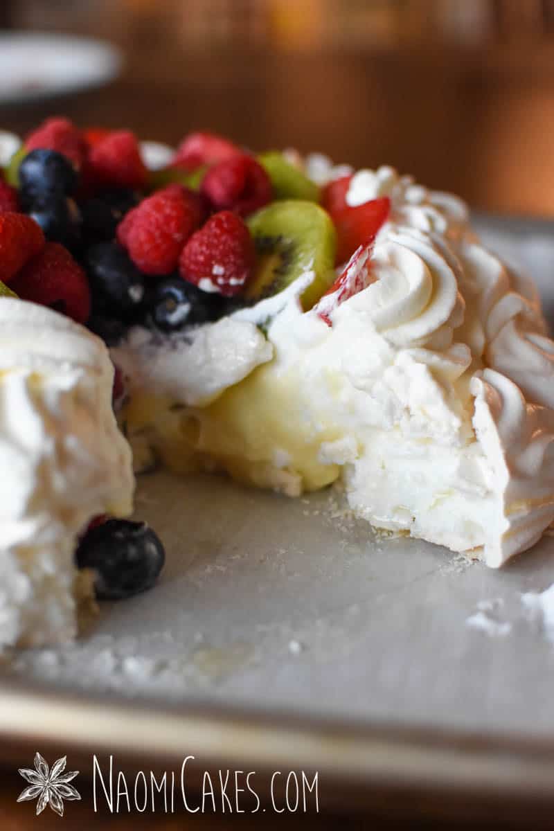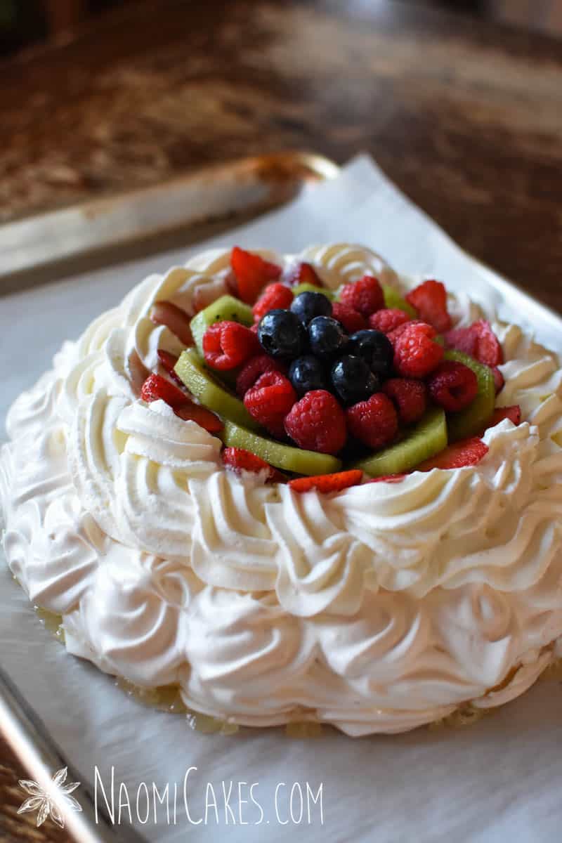 Pavlova is a crisp, sweet meringue shell filled with freshly whipped cream and fresh fruit (or in this version, an additional layer of custard in the middle). If you like meringue cookies, this recipe is the “cake” version of the same thing… but a little extra deluxe with the additional toppings.
