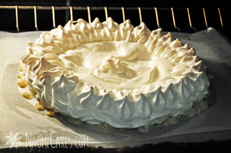 Bake the meringue in a 225 degree F oven for 1 hour or until dry and just barely golden. Turn the heat off, and allow the meringue to rest in the warm oven for 2 hours with the door closed.
