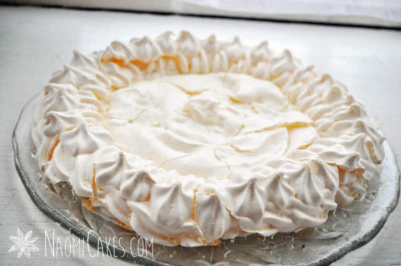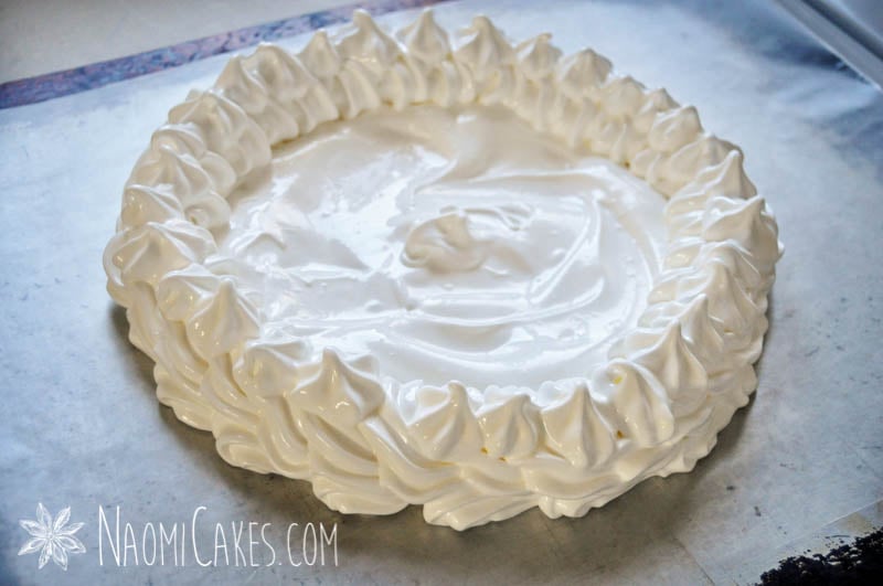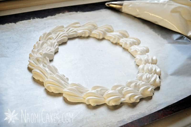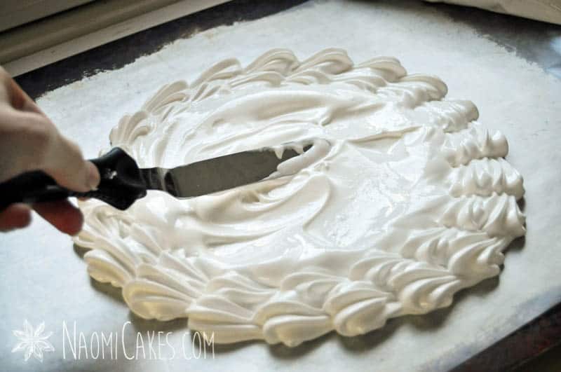 Spoon the meringue into a large, 18" piping bag fitted with a large star tip (such as tip #846). Pipe 2 rows of shells around the outside of the circle, and then use a palette knife or the back of a spoon to fill the middle of the circle with more meringue. Pipe two more rows of shells on top of the first ones, and then a finishing layer of meringue rosettes on top of that.