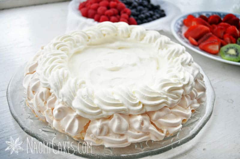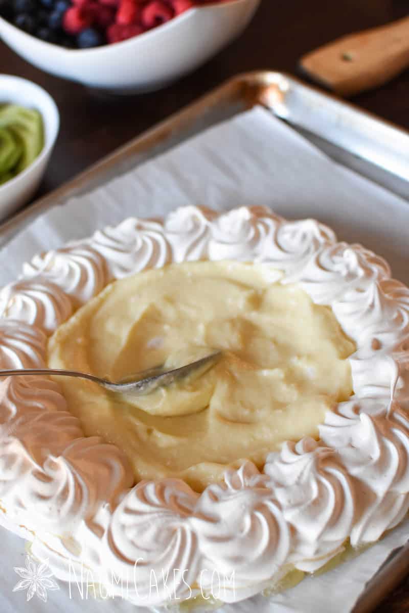 Scrape the cooled custard into the centre of the baked meringue shell. Spread the custard evenly, and then pipe 2 rows of cream in a circular motion all the way around the perimeter of the pavlova. Spread any remaining cream into the centre.