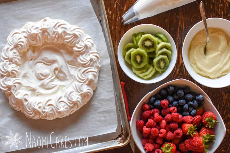 Once the meringue is baked and the custard has cooled, wash and slice all of the fruit as desired. Carefully loosen the meringue from the parchment paper and slide it onto a serving plate.