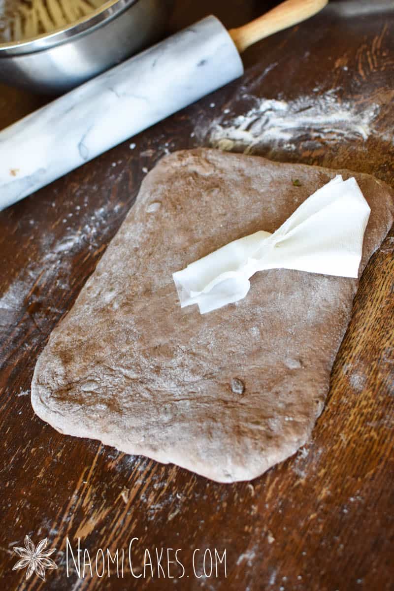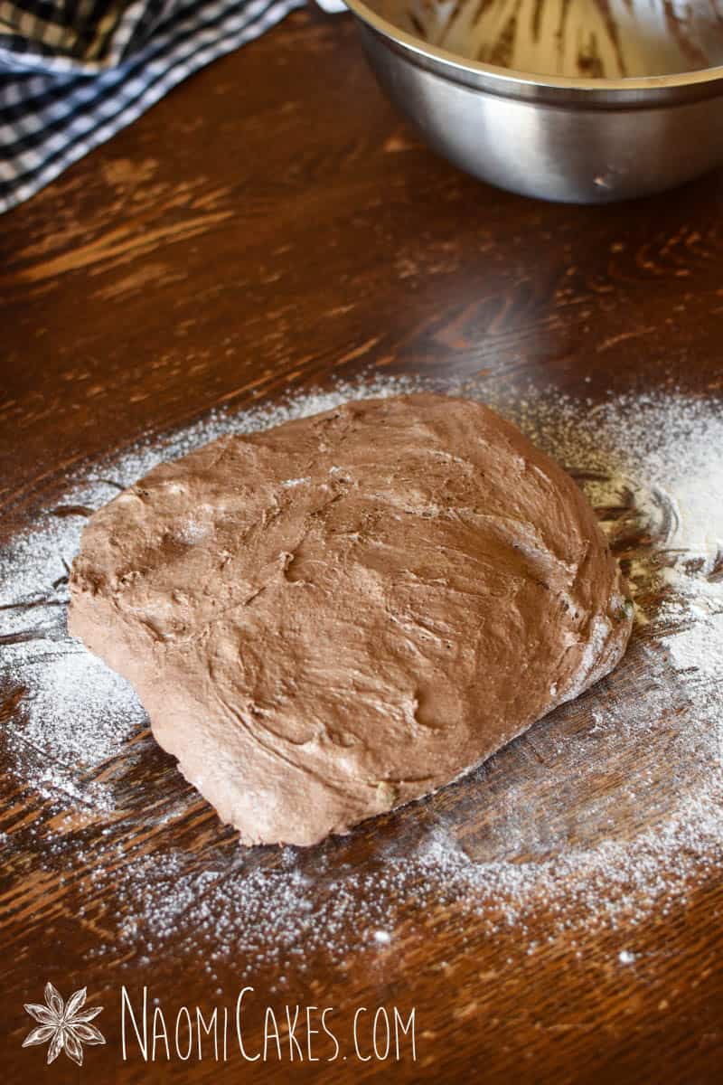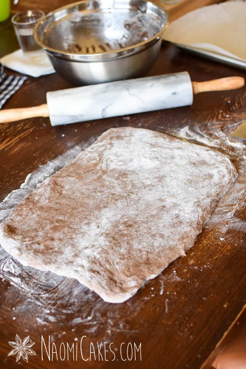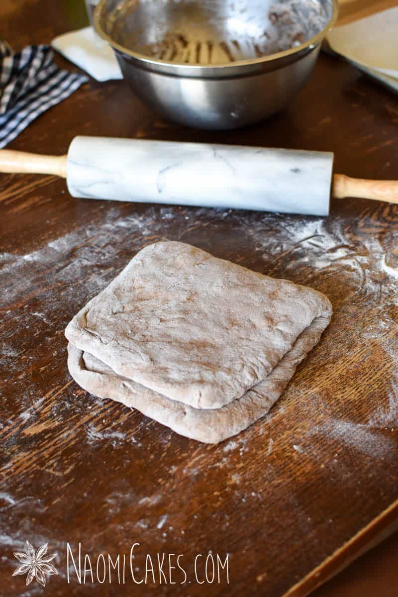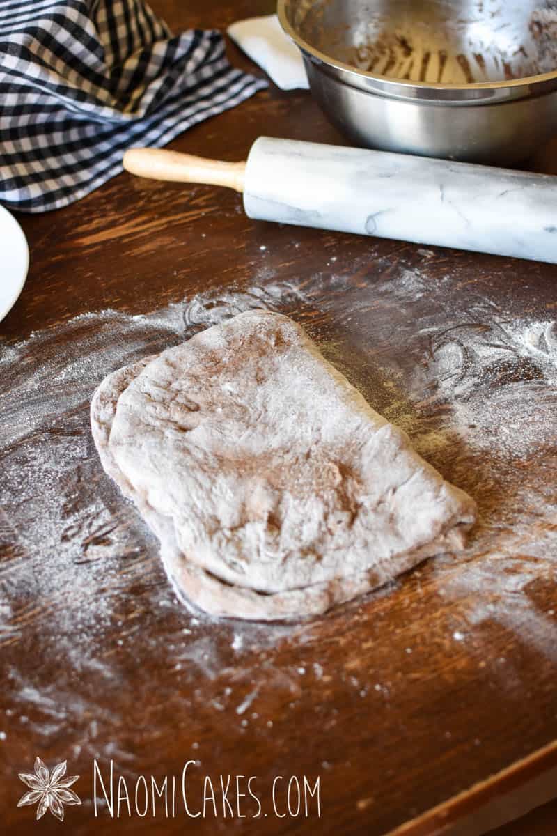 Turn the dough out onto a well floured work surface (it will be very soft and sticky), and roll it into a 9×13-inch rectangle. Fold the dough in half, and re-roll into a 9×13-inch rectangle again, keeping enough flour down to prevent the dough from sticking to the table.