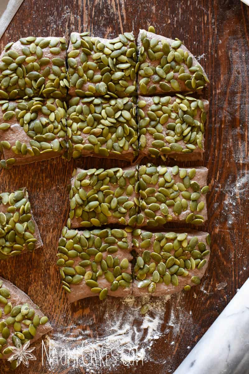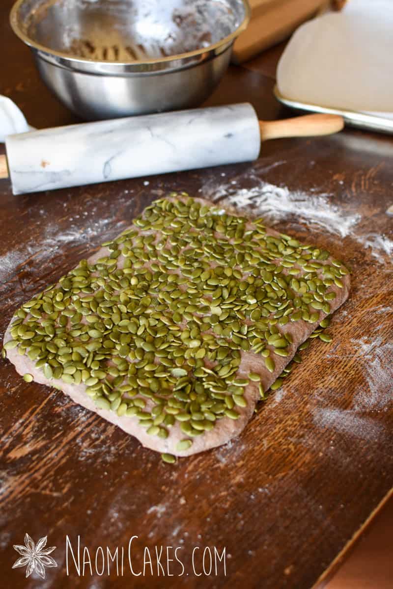 Using a clean, wet cloth or paper towel, dab the surface of the dough all over to make it tacky. Sprinkle generously with pumpkin seeds, to cover the whole surface, and pat down to make them stick.