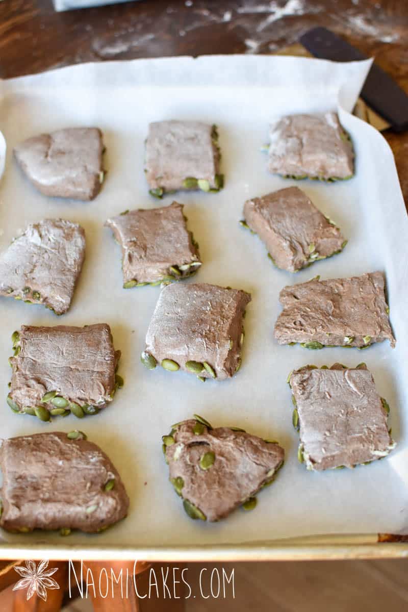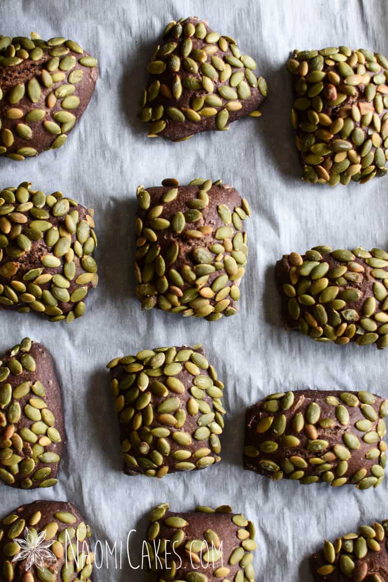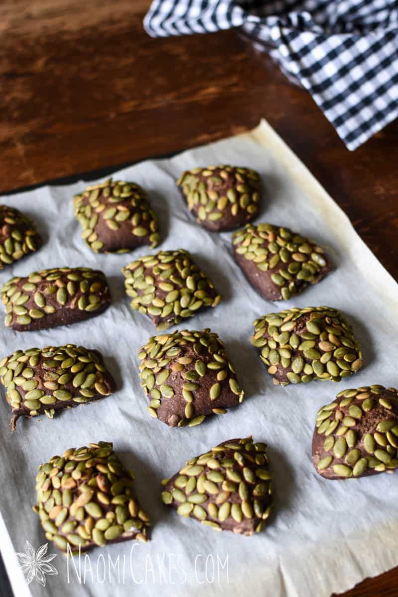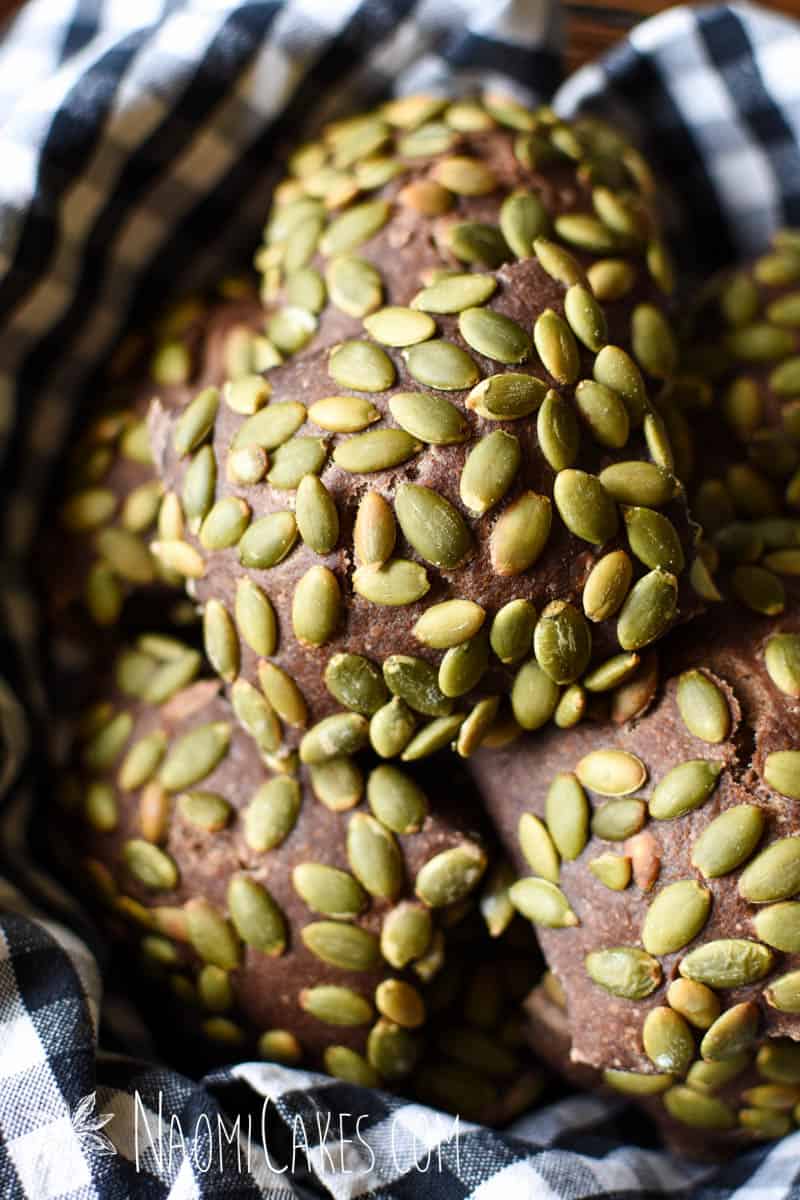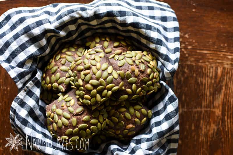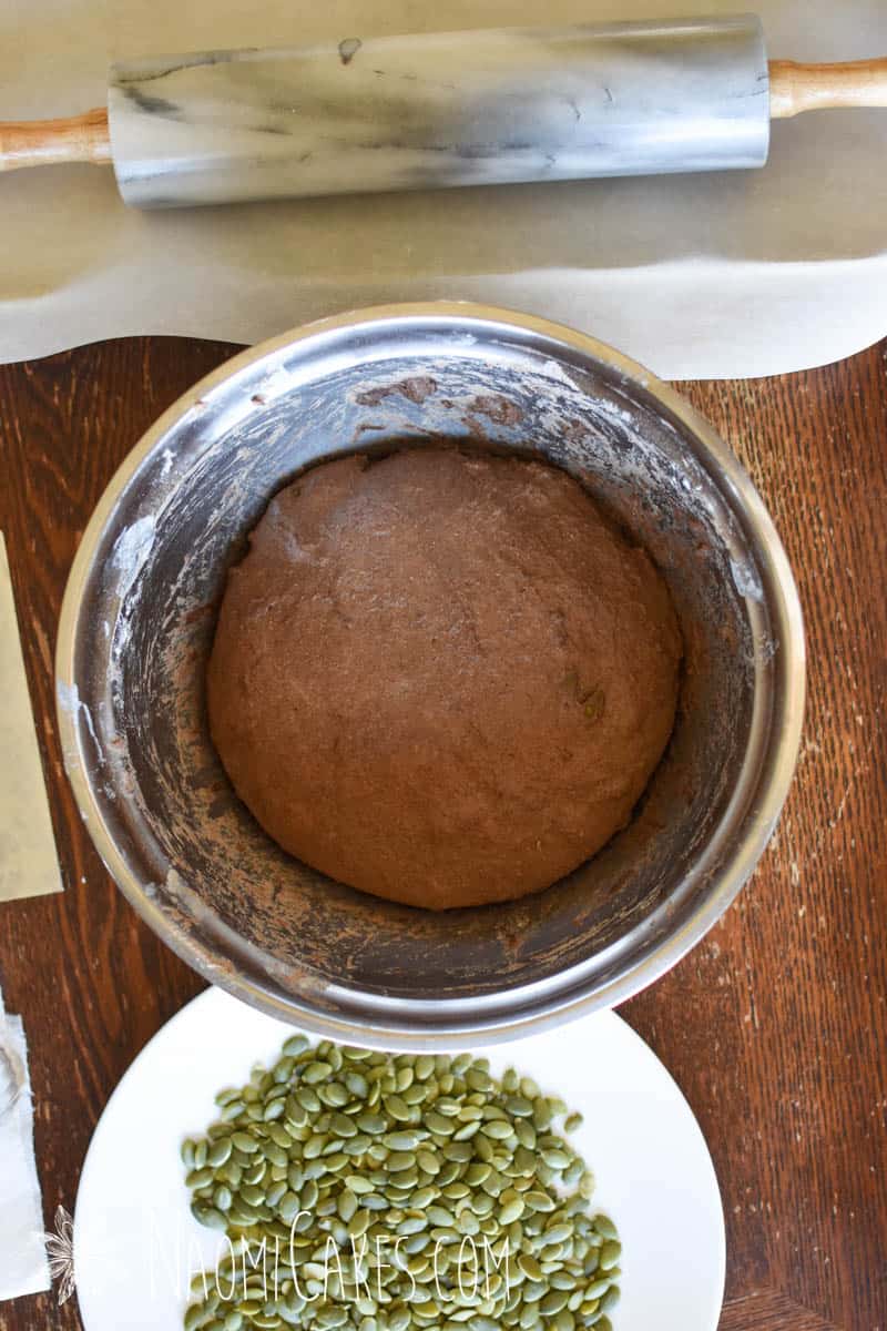 This one is definitely optional, but especially when it comes to sticky doughs, I love baking on parchment to make sure that my bread does not stick. For this recipe in particular, to keep the pumpkinseeds densely covering the tops of the rolls, I let them proof upside-down, and then I flip the whole batch over onto a sheet of parchment to bake.