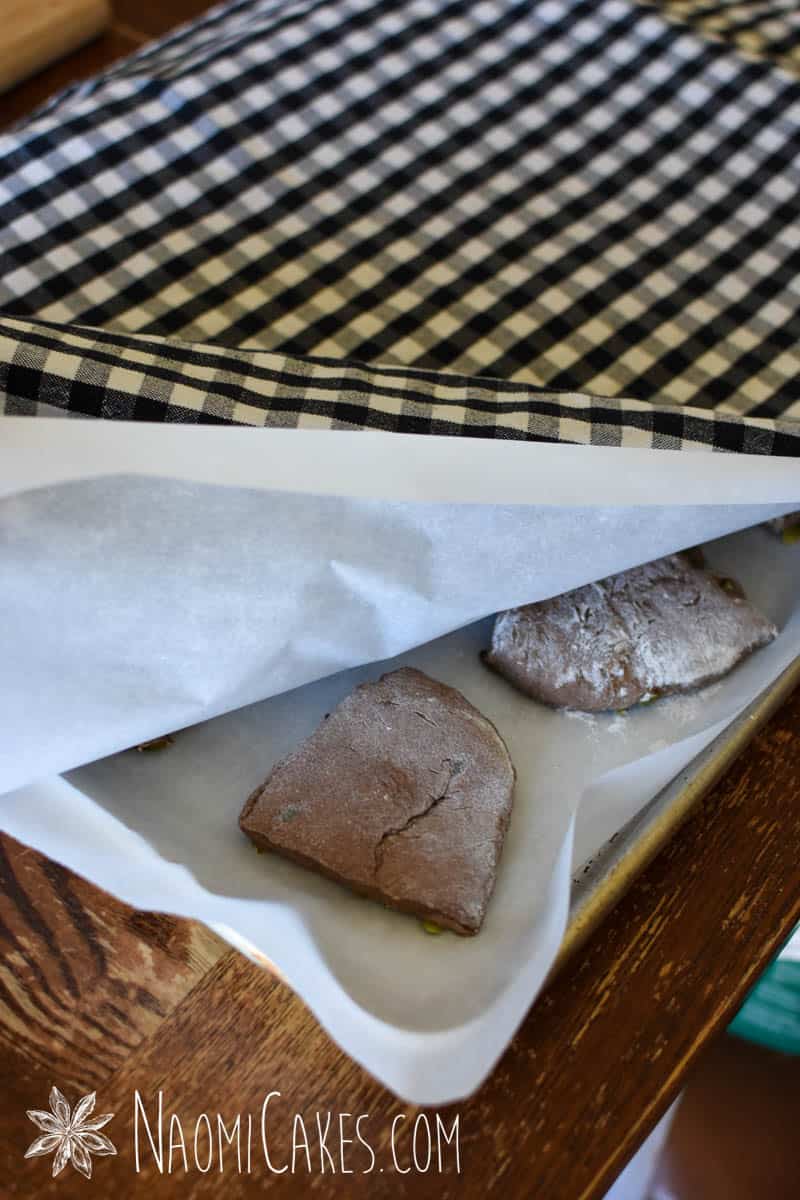 Using a bench scraper, cut the rectangle into 12 square rolls. Turn each roll upside down (seed side down) onto a parchment lined cookie sheet, leaving some room between the rolls to expand. Cover the rolls with another sheet of parchment, and then a tea towel to weigh it down. Place the pan of rolls in the fridge and leave them overnight (12-24 hours).