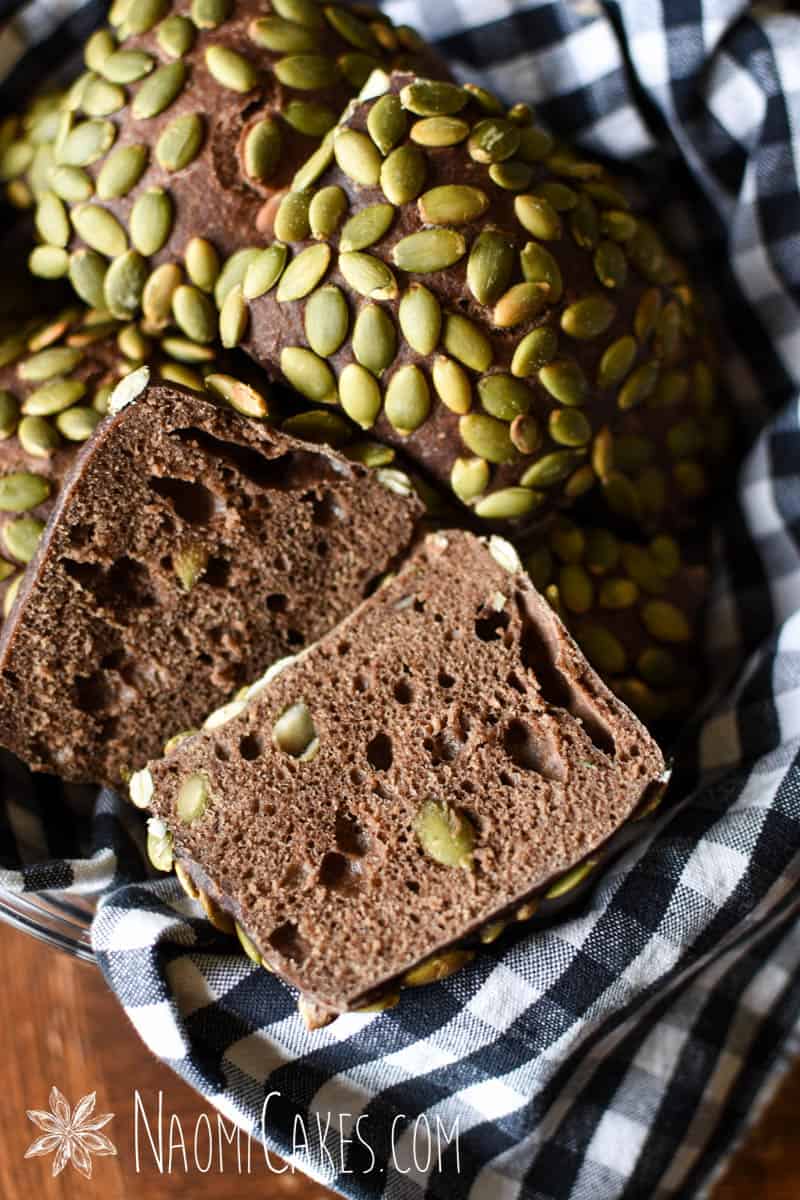In this recipe, I am using a regular rye flour with the additions of cocoa and molasses to give it that dark look and rich flavor.
