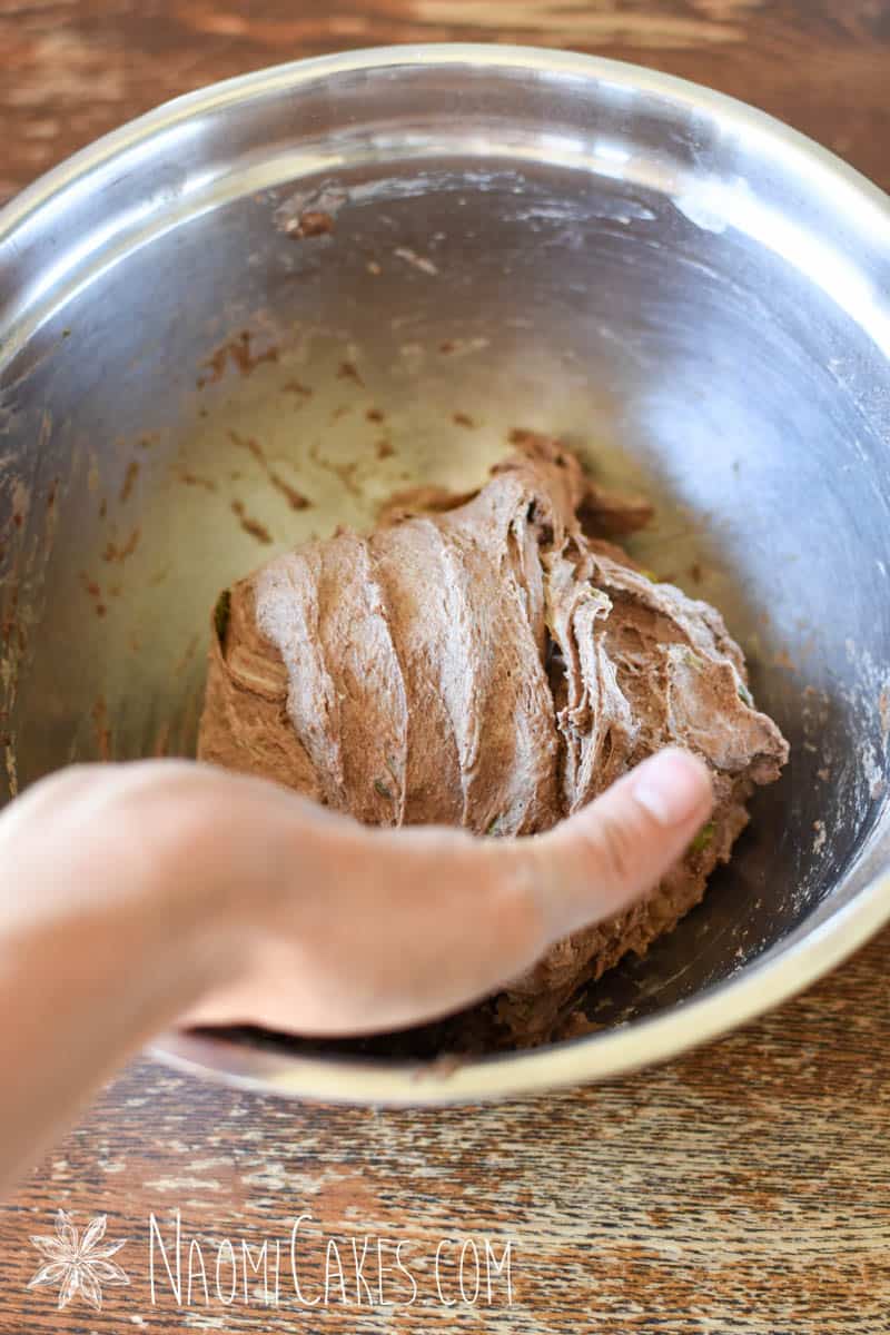 After 30 minutes, reach your hand under the dough slightly and pull it up enough to fold it back over itself. Repeat this process 3-5 times or until the dough has a slightly smoother look. Cover and allow this to rest for another 30 minutes.